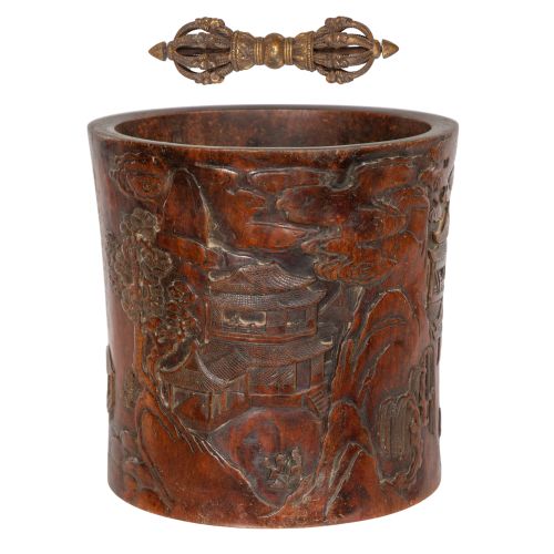 275 Himalayan Gilt Bronze Vajra and Chinese Carved Wood Brush Pot ESTIMATE: $600 – 800 HAMMER PRICE: $550