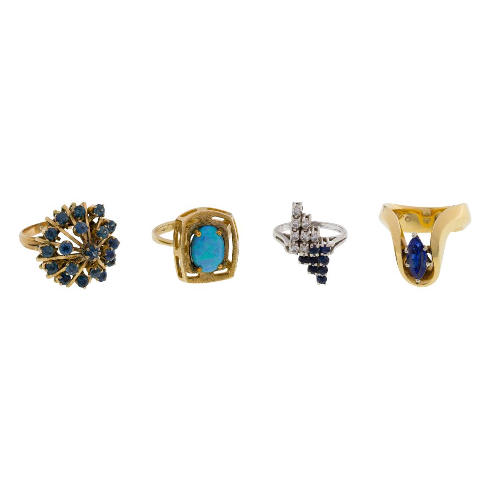 (4) items including in yellow gold a sapphire princess, a marquise cut sapphire, an oval opal as well as in white gold a diamond and sapphire (all marked “14k”)