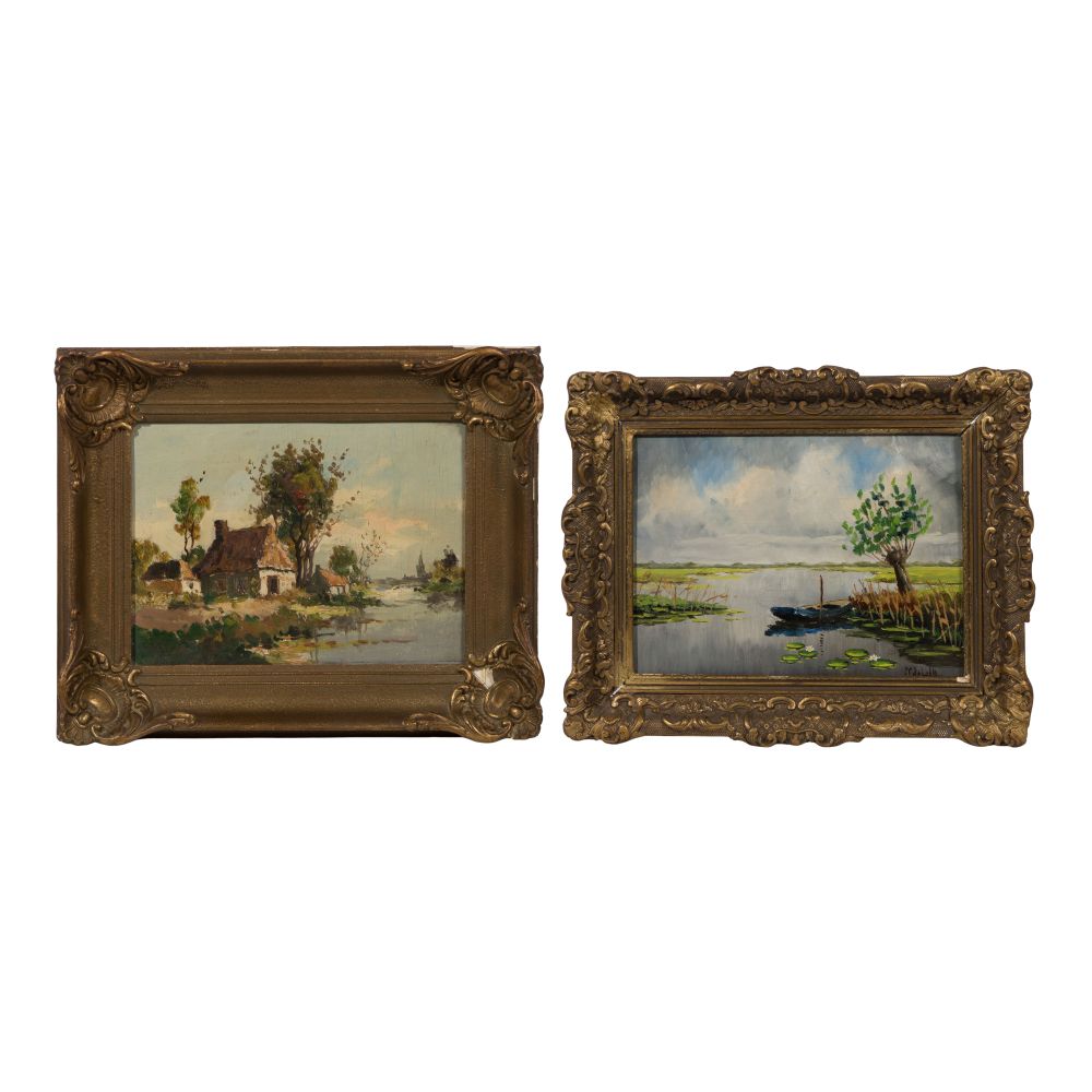 (2) undated items, one illegibly signed depicting a rowboat on a river and houses on an inlet and the other depicting a boat near the reeds, both in frames