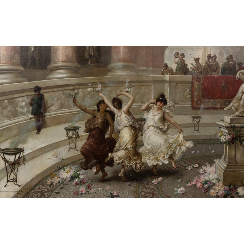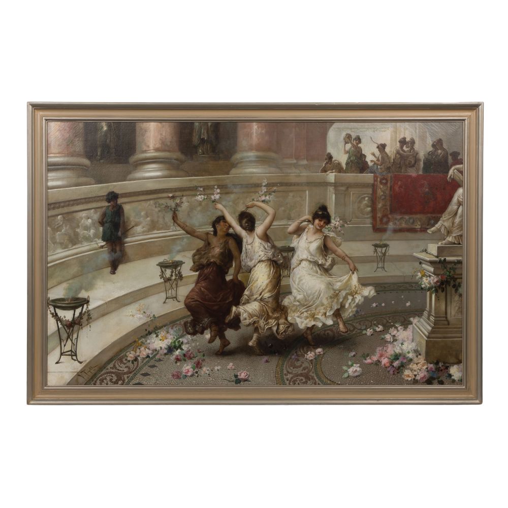 1891, signed lower left, depicting three women dancing, in a gold-tone painted wood frame, retaining a copy of an invoice from the Galt Gallery, Fort Lauderdale, Florida and a conservator invoice and list of work done