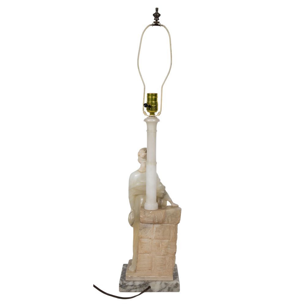 Depicting a robed figure leaning against a stonework wall that supports the columnar lamp standard, on a mottled gray marble base