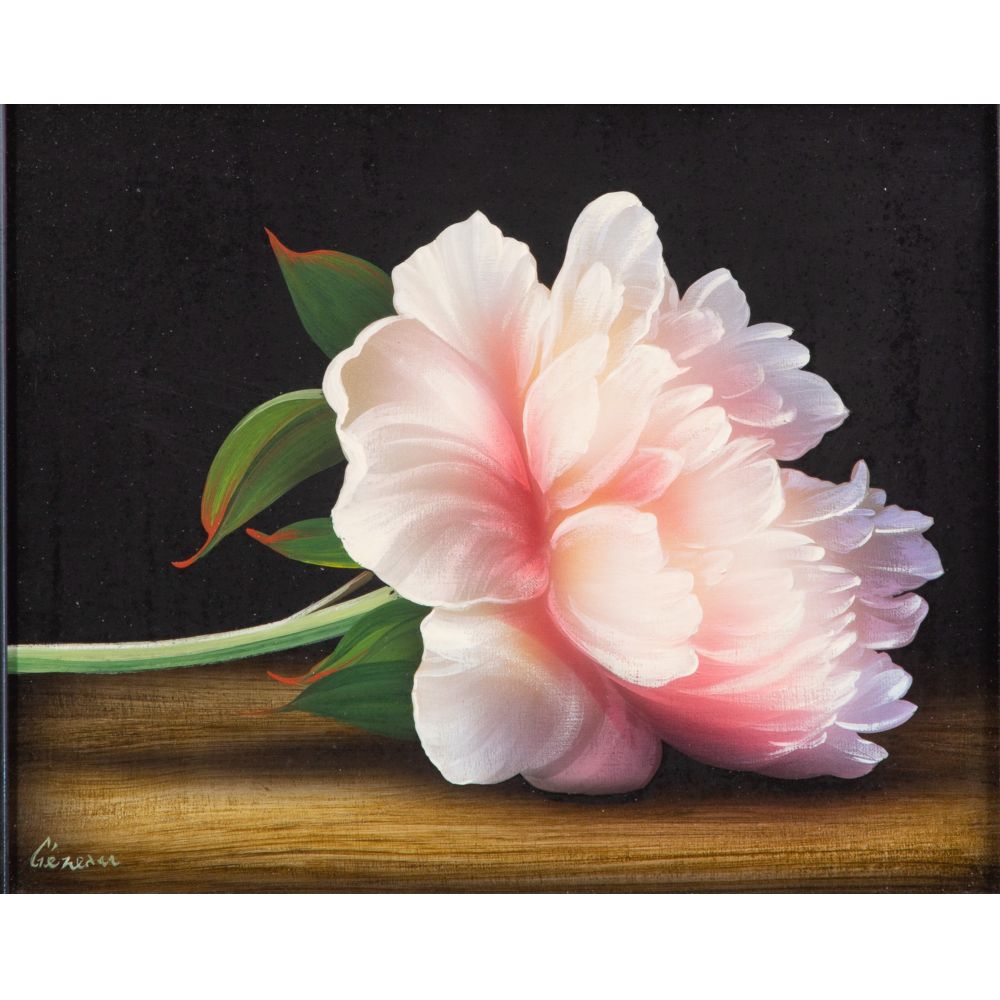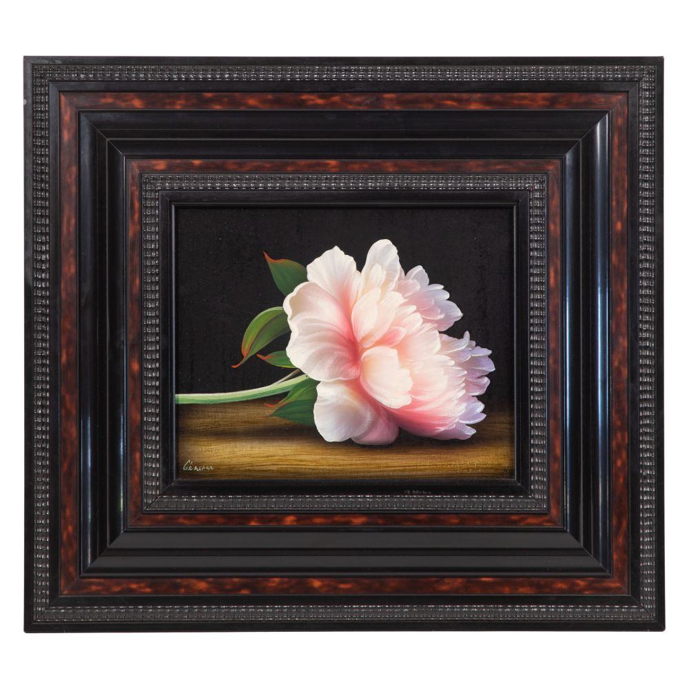 Undated, signed lower left, depicting a single peony against a dark background, in a lacquered wood and faux tortoise frame, documents from Wally Findlay Galleries, an exhibition catalog featuring the work and a bill of sale dated 1996