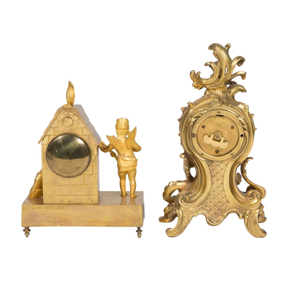 (2) items, both in gold-tone metal cases, the Ansonia having an enamel Roman numeral dial in a Baroque style case having attached putti, marked on back near winding knob, the Lepine marked on the enamel Roman numeral dial in a case depicting a stonework building flanked by a winged putto in military cap, holding a long gun and a dog, an bow and quiver of arrows in relief on the base, brass movement marked “J. Marti”, no key
