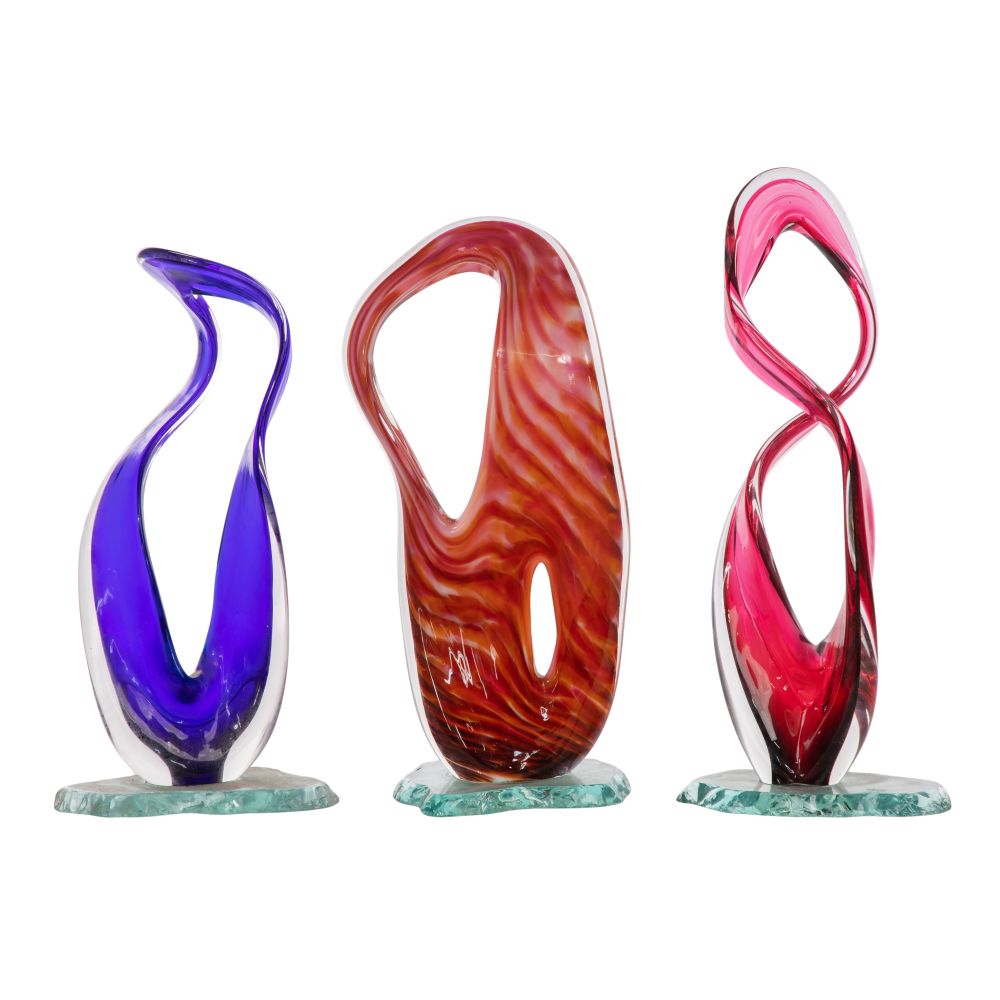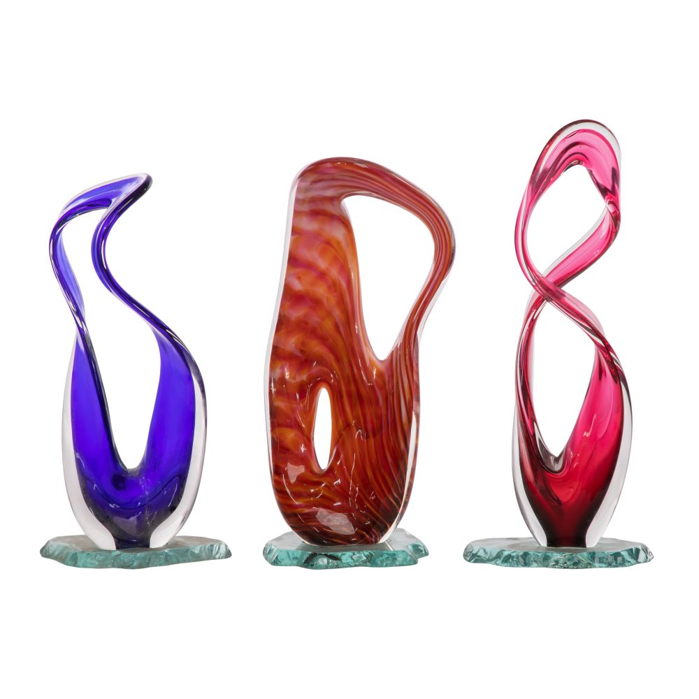(3) items, each having a twisting design and color ribbons through centers, on a cracked edge clear base