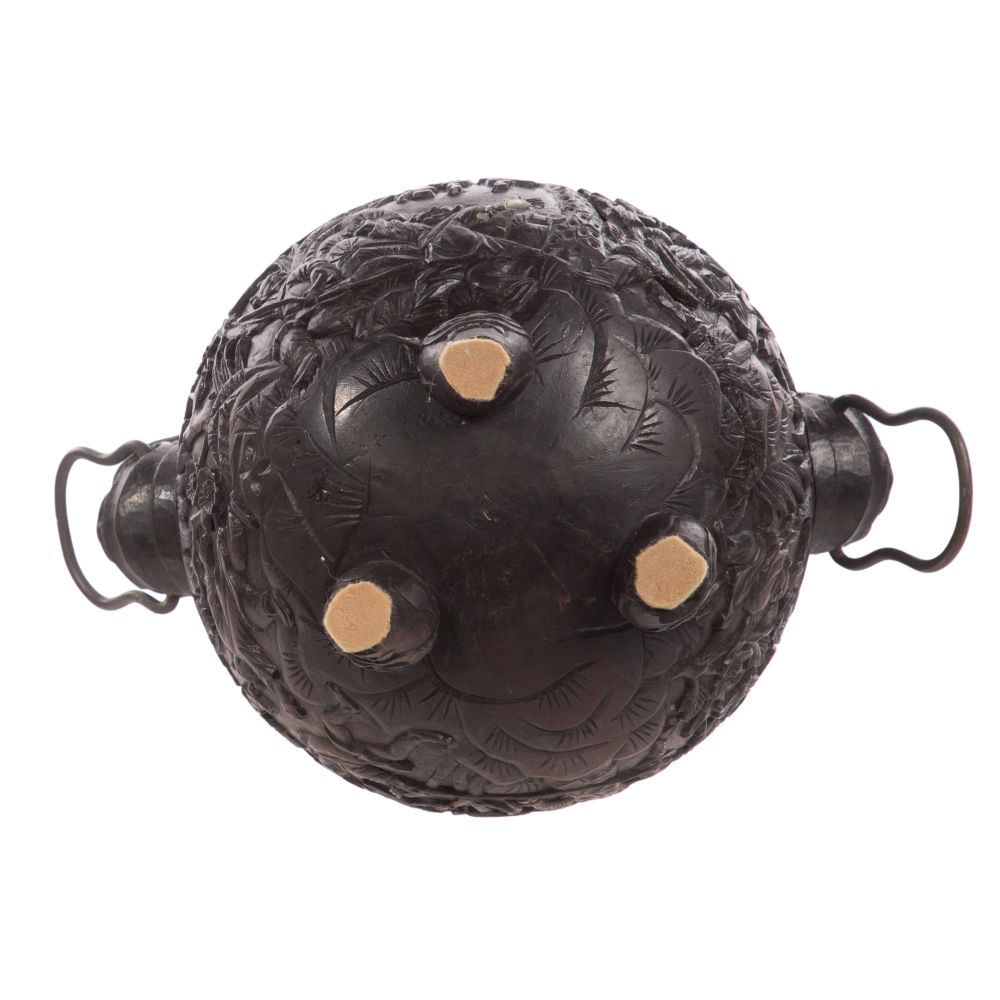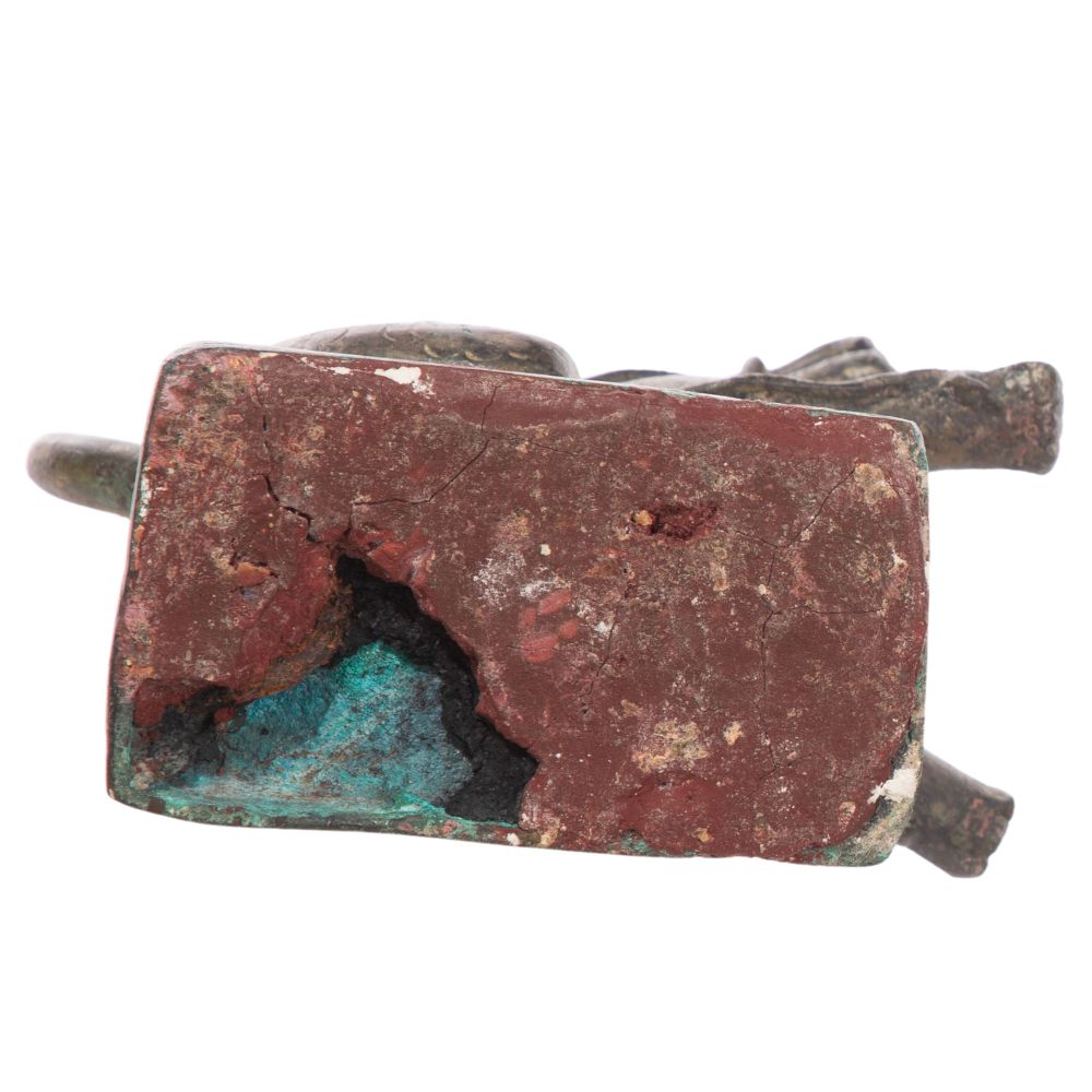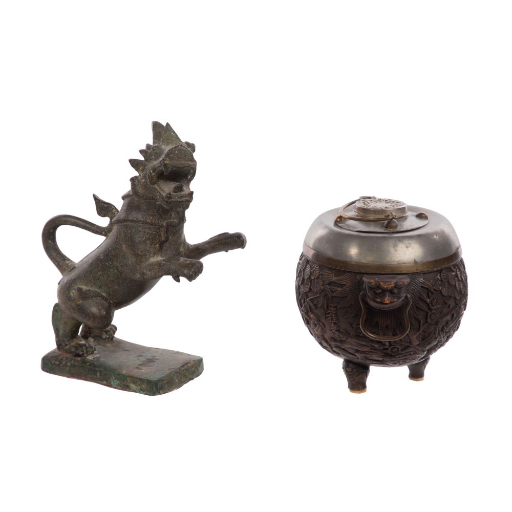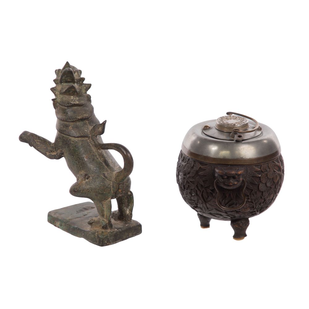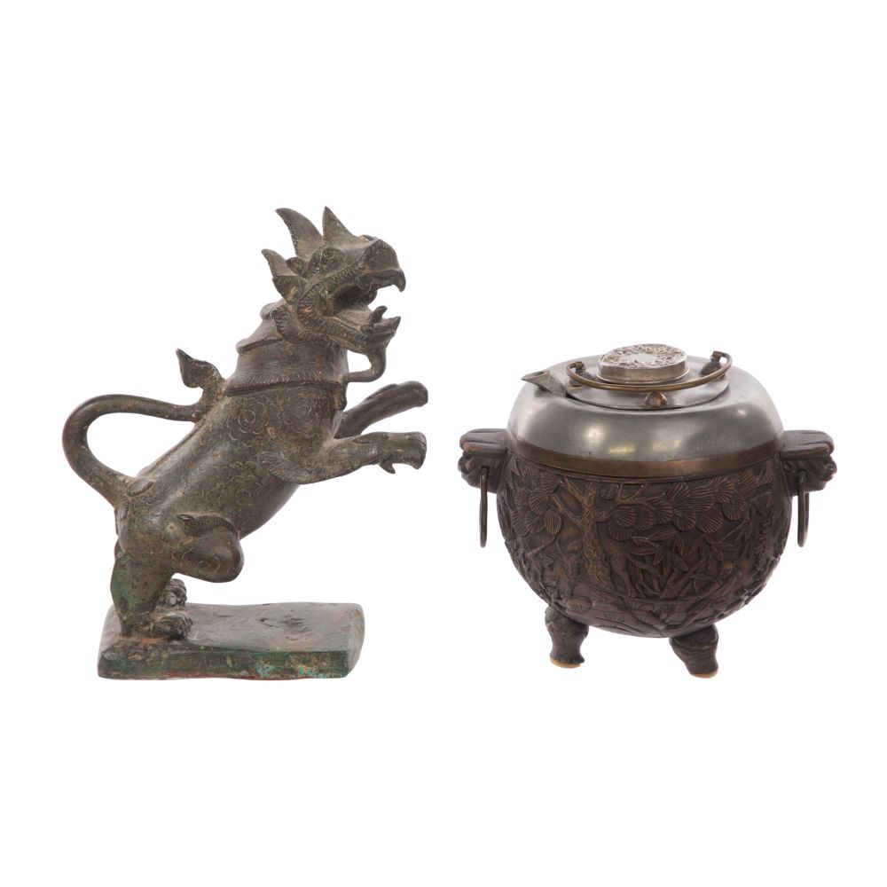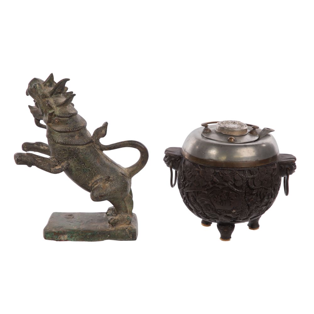 (2) items including a Chinese bronze figure of a qilin, standing on its hind legs on a rectangular base and a Japanese bronze censer having intricate relief decoration, a metal lid and two large handles on the sides