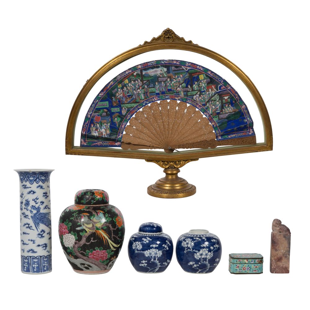 (7) items including a pair of ginger jars, a hand painted fan in framed, a bird and floral themed ginger jar, a carved stone seal, an enameled metal box and a dragon themed vase