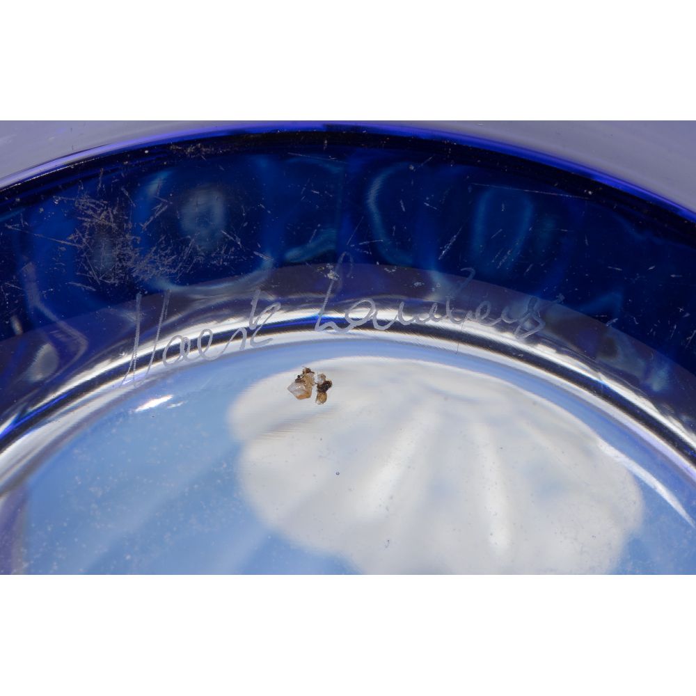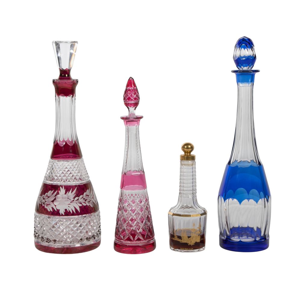 (4) items including the Baccarat (retaining some contents) having gilt shoulder, rim and stopper, etch marked underside, a blue cut-to-clear having indistinct engraved signature underside and (2) unmarked red cut-to-clear, all having stoppers