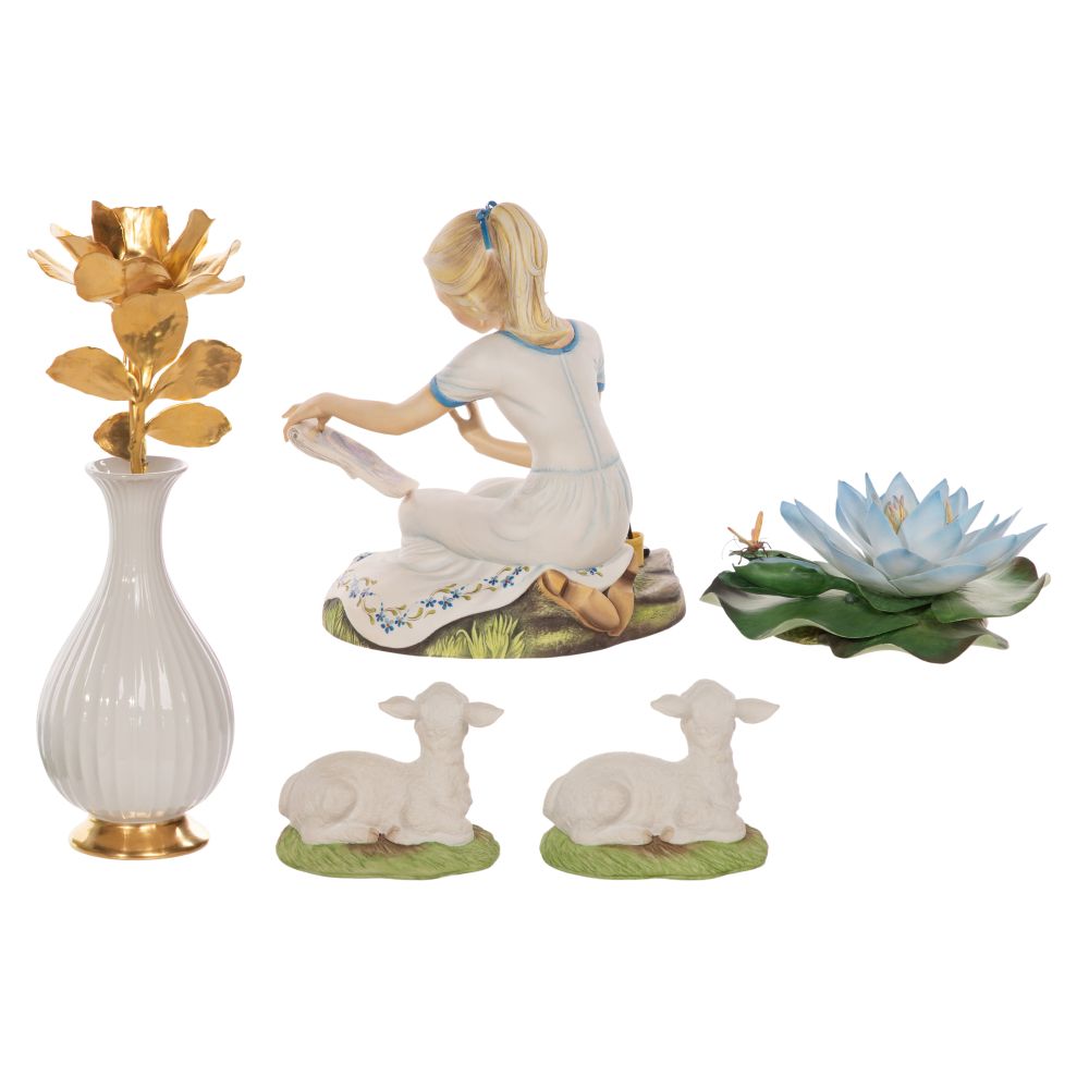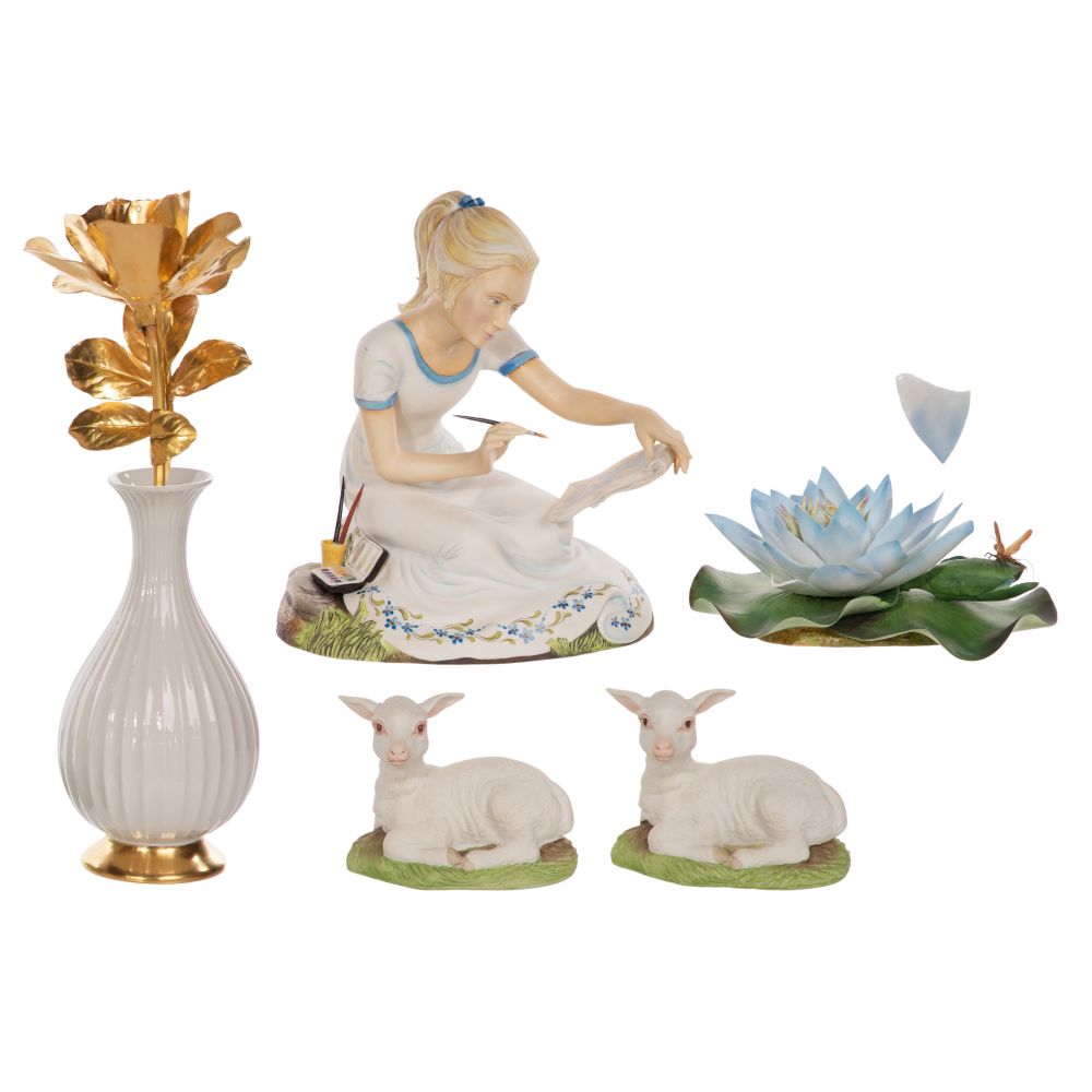 (6) items including a #700-4 Paintress, a limited edition blue lily pad, (2) #400-97 lambs, a #700-8 vase, all stamp marked underside, and a gilt rose having painted mark “Boehm 92”