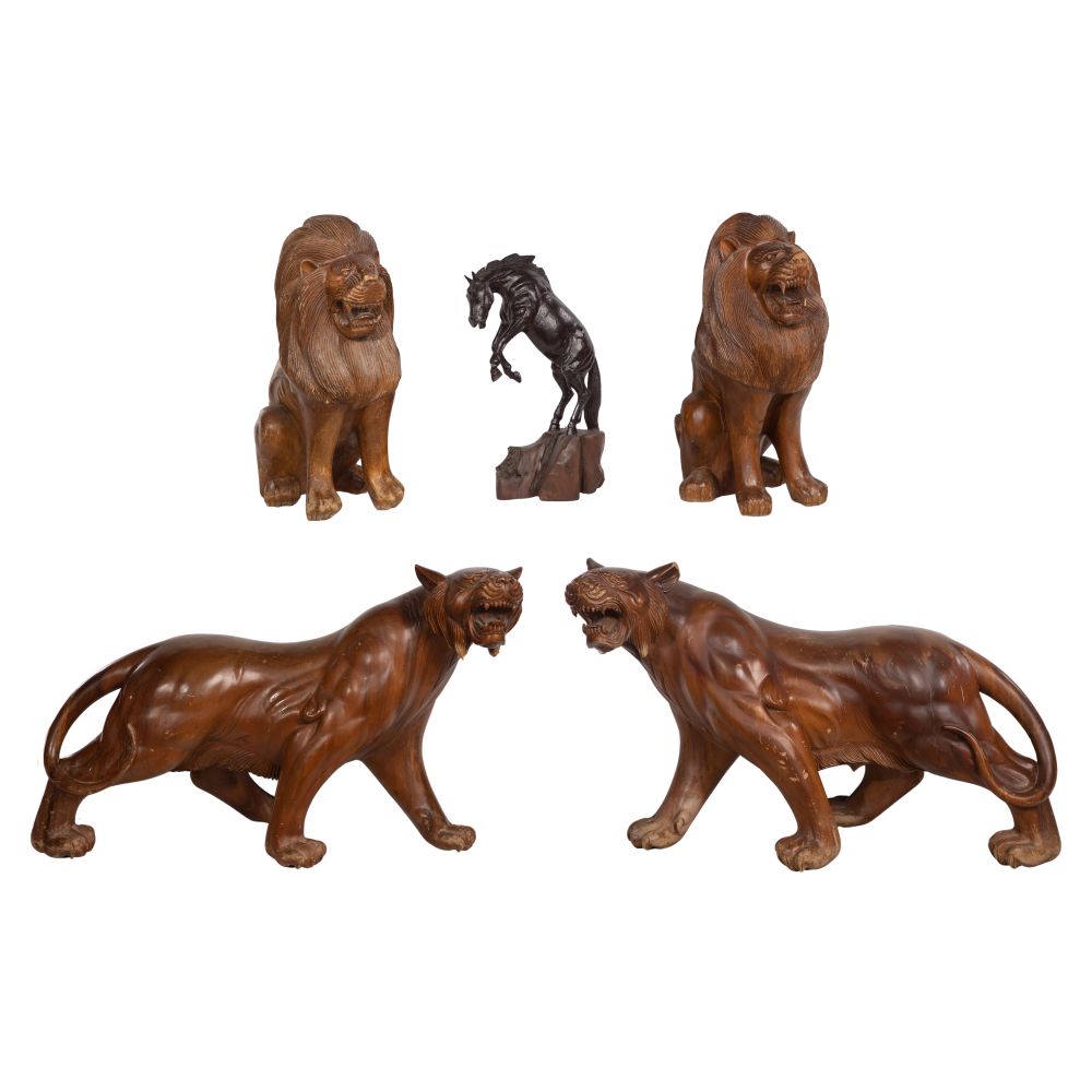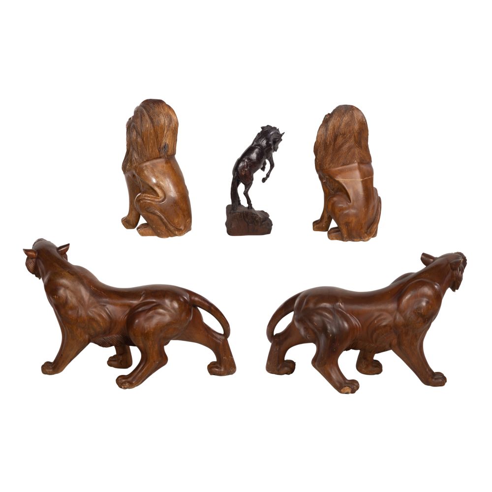 (5) carved wood animals including a pair of seated lions, a pair of walking tigresses and a rearing stallion