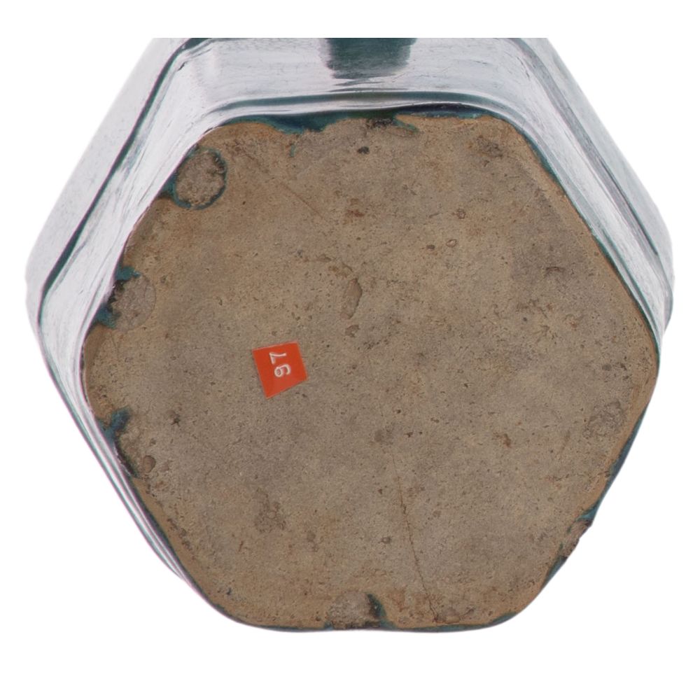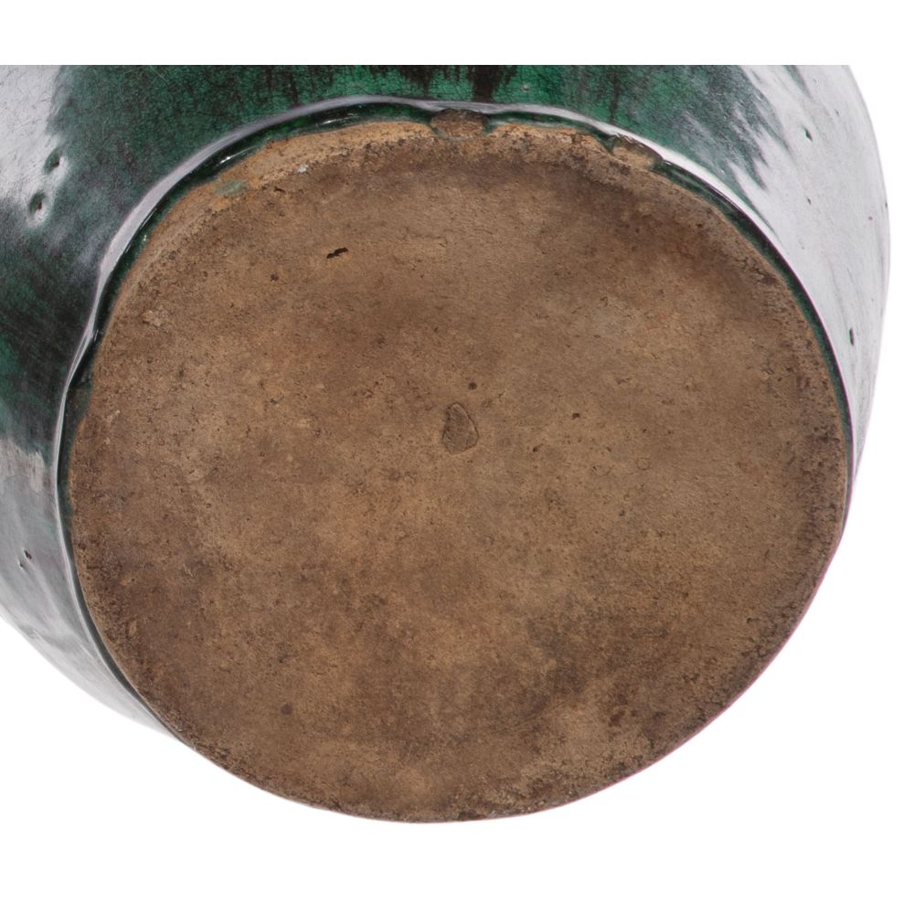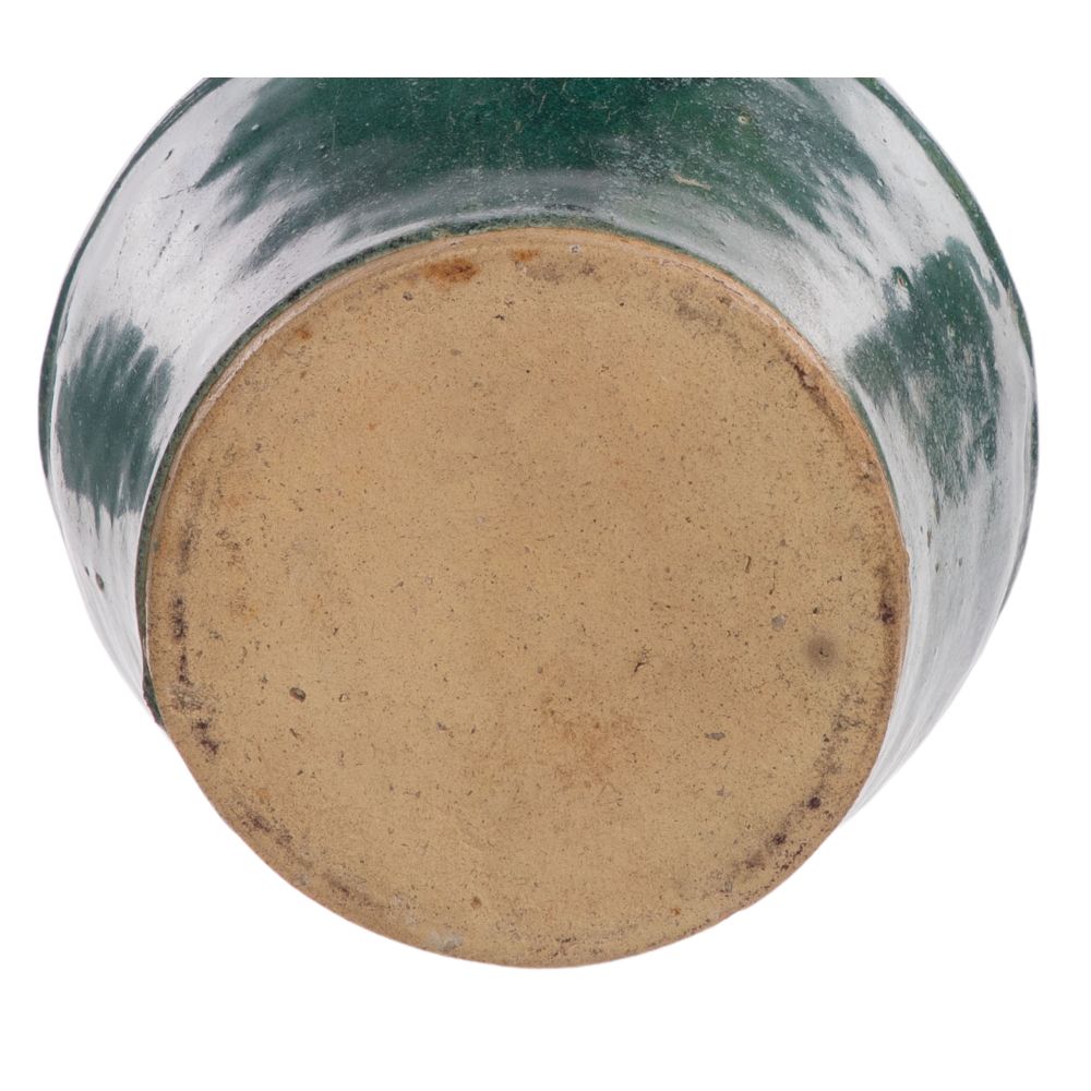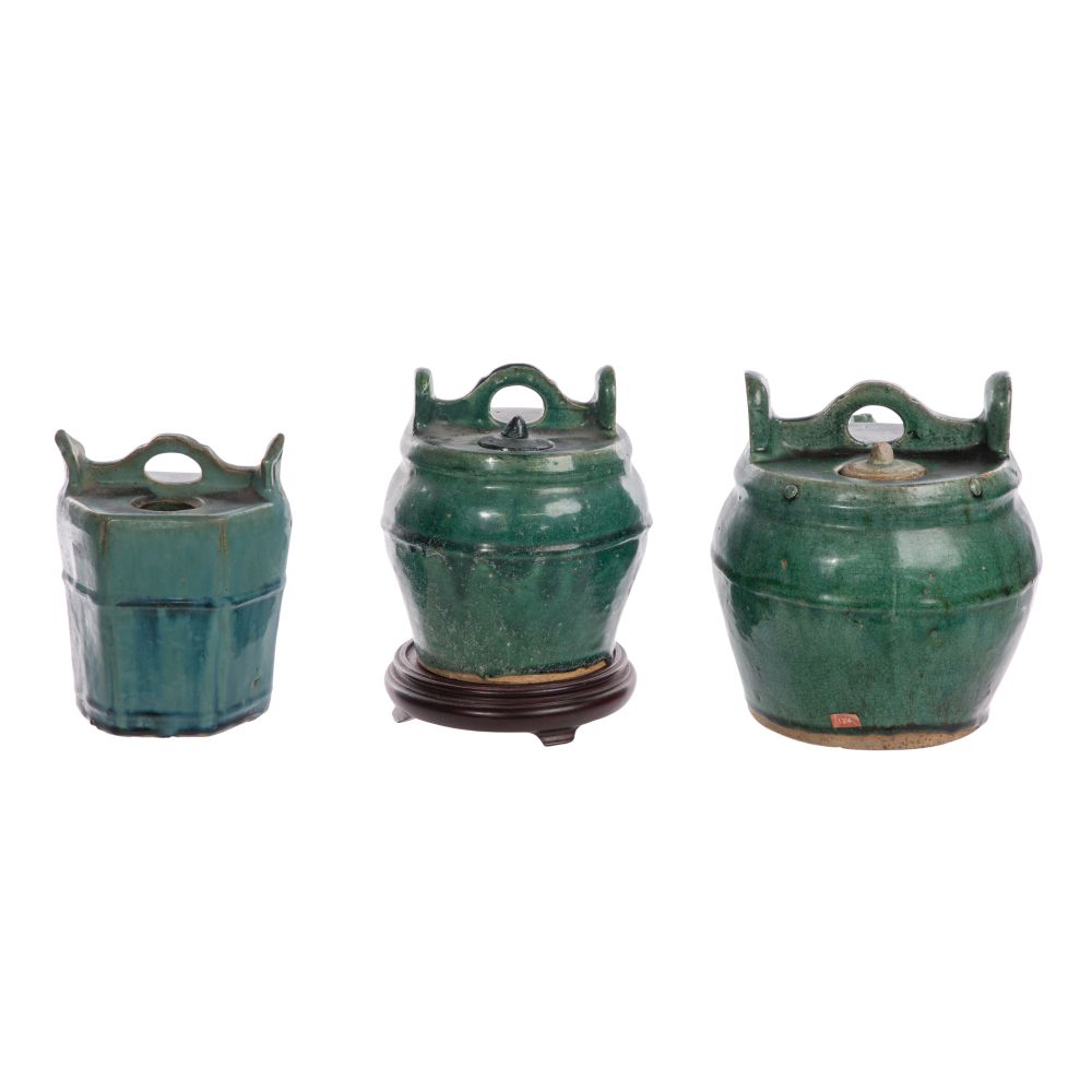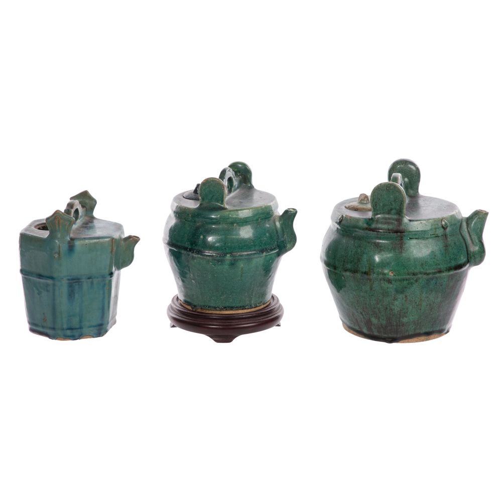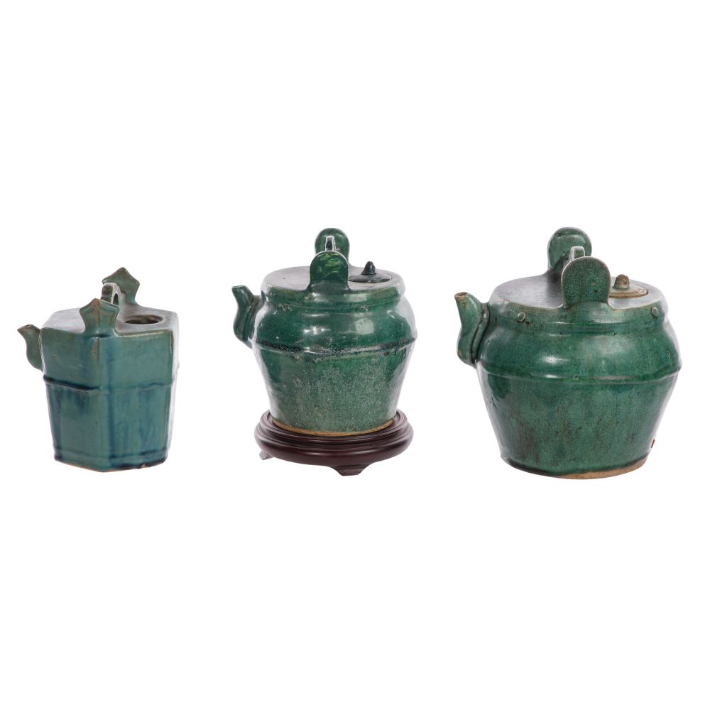 (4) total items including (3) green glazed Shiwan pottery hexagonal and round form teapots with a pouring spout, small lid and carrying handle; together with a wood stand