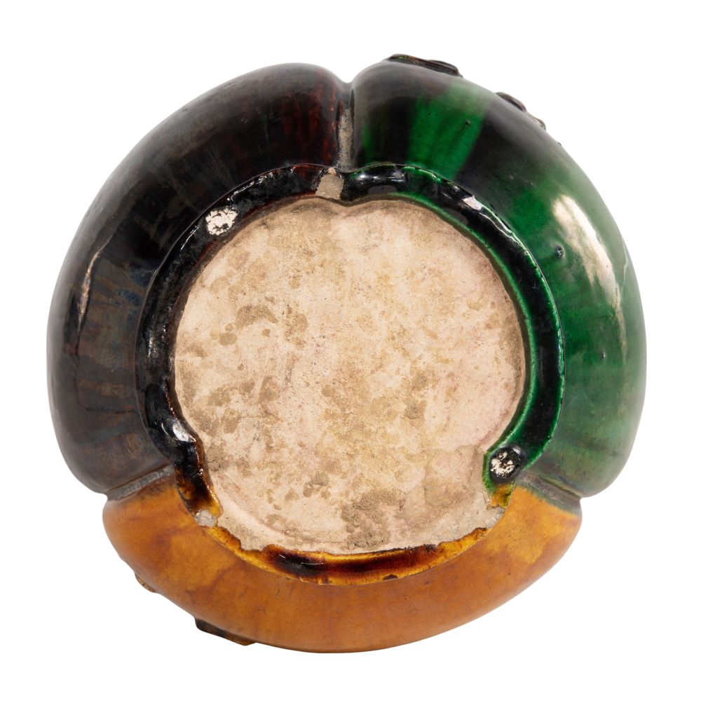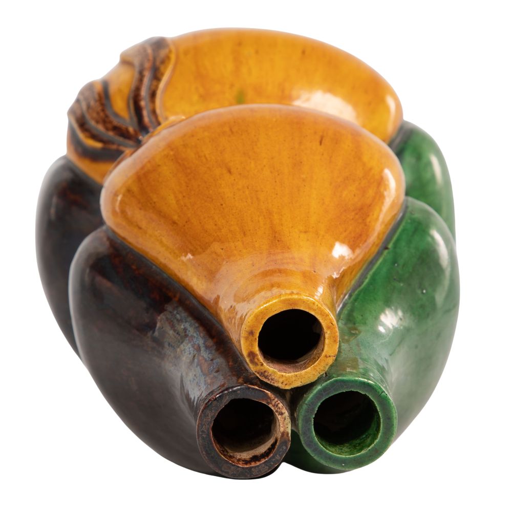 Sancai glazed in yellow, green and dark aubergine, depicting three vases joined by a sash-tied bow, unmarked
