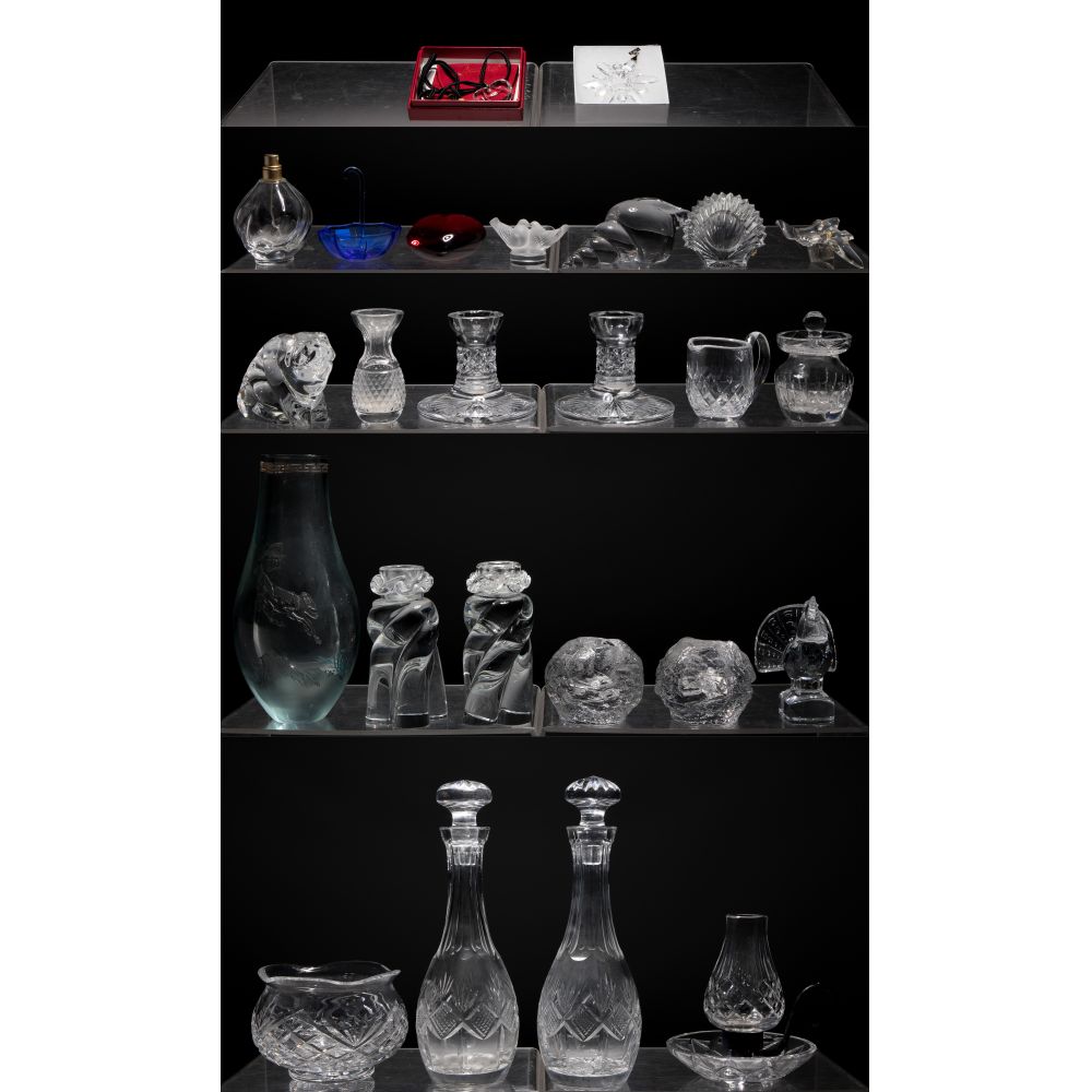 (24) items including a Kosta Boda votive set, a Baccarat red heart paperweight, a St. Louis seashell paperweight, a Baccarat candle holder set, an empty Nina Ricci perfume bottle, a Cristal Sevres umbrella, Lalique lovebirds, a Baccarat heart necklace, a Hadeland grouse, a Chinese Peking heavy etched vase, a snowflake ornament and Waterford items including (2) decanters, a candle holder set, a dog paperweight, a cream and sugar set, a bud vase, an empty clock body and a table oil lamp