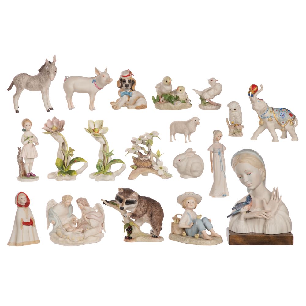 (19) items including animal, floral and human forms, in pale bisque having various color details, all marked on undersides