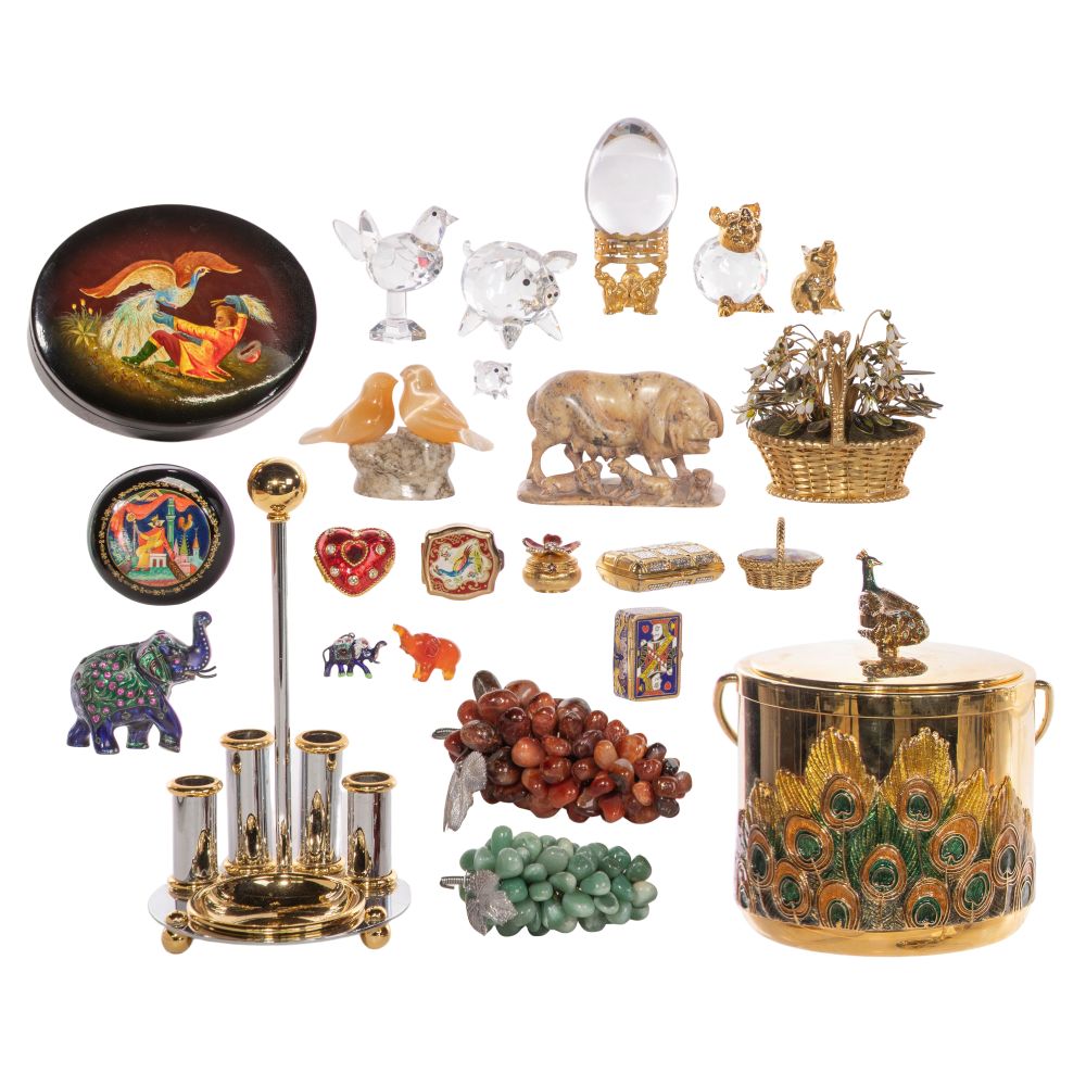 (24) items including a brass lipstick holder, a brass peacock feather motif ice bucket, (2) carved stone grape clusters (red and green), a brass basket of porcelain on wire flowers, a crystal egg having brass stand, (10) animal figurines including stone, crystal and porcelain, (8) trinket boxes of various sizes including two enamel and crystal (one marked “Jay Strongwater”), a crystal encrusted, three enameled and two lacquered wood