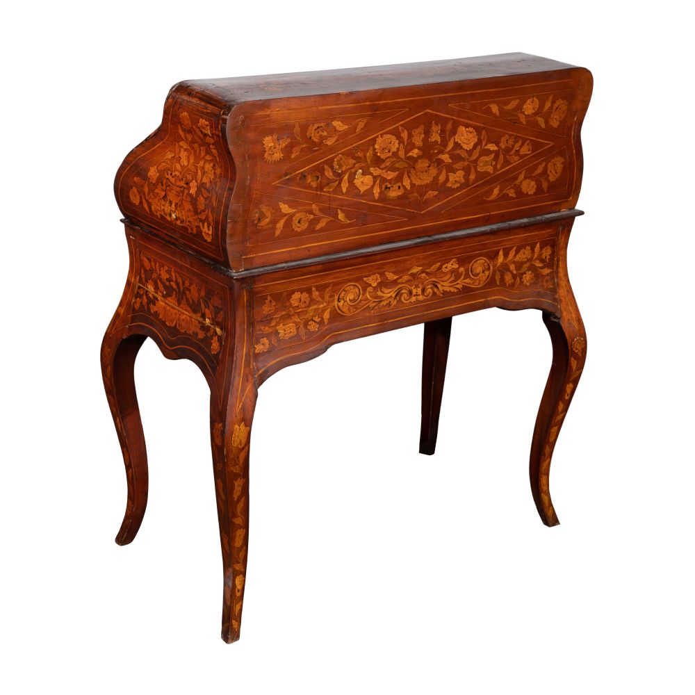 Floral motif inlaid throughout, front opens to writing compartment fitted with prospect door, pigeonholes and drawers, above a single drawer on cabriole legs