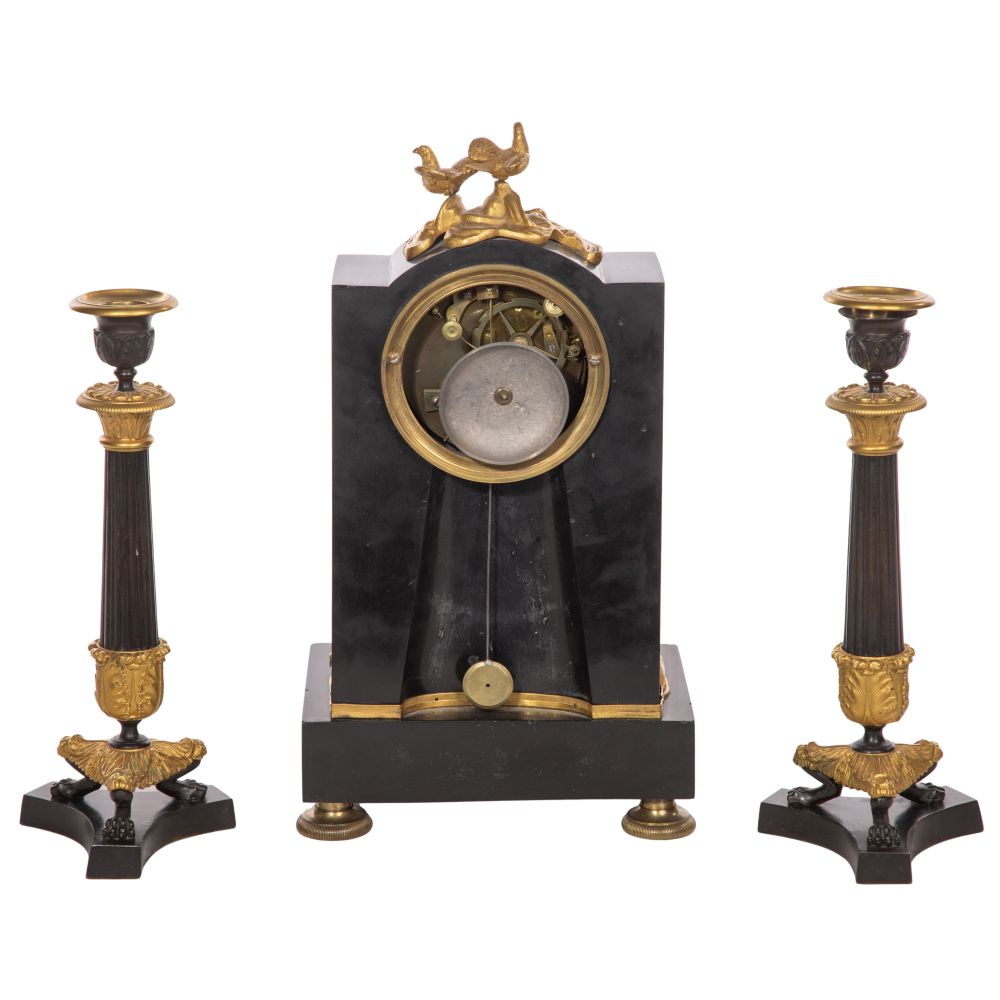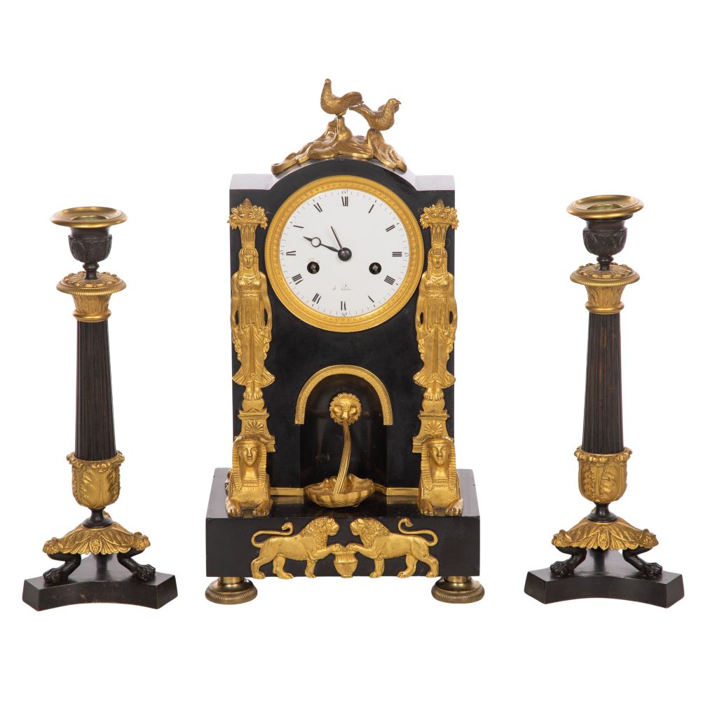 Ormolu mounted slate case surmounted by avian finial, enamel Roman numeral dial marked “a Paris” having two key ports, flanked by Egyptian style figures above a grotesque fountain head spewing a stream into a scallop shell flanked by two sphinxes, two affronted lions on the base supported on four feet, unmarked brass movement, pendulum present, as well as a pair of candlesticks and bobeches, 1974 invoices from Alex Janniche & Co., Copenhagen, Denmark giving an attribution of Lepine a Paris