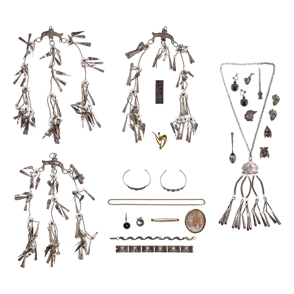 A gemstone pin (unmarked gold), necklaces, pendants, spoons, pins, earrings (unmarked silver) and a match box (unmarked 800) as well as a few pieces of costume jewelry