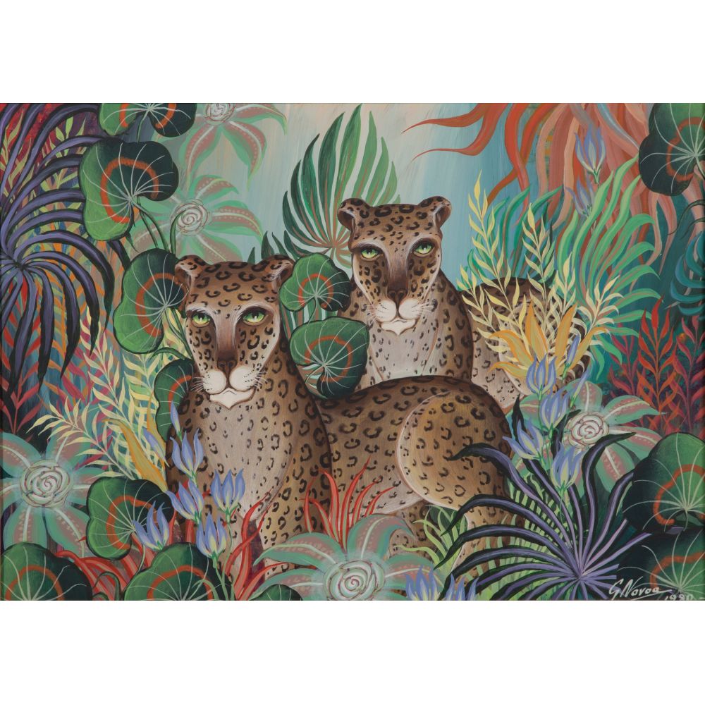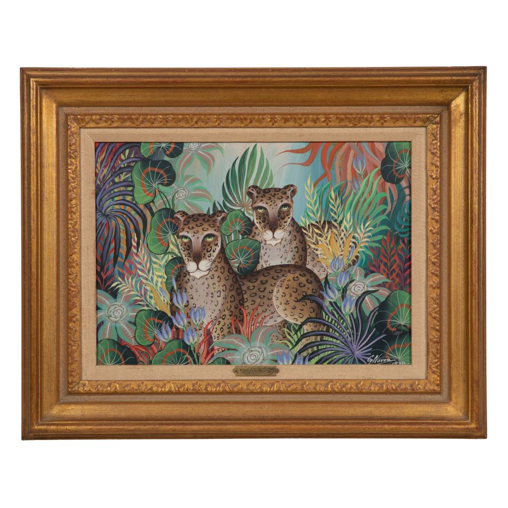 1980, signed and dated lower right, depicting a pair of leopards in a jungle landscape, in a gilt wood frame and linen liner, documents from Wally Findlay Galleries and a bill of sale dated 1980