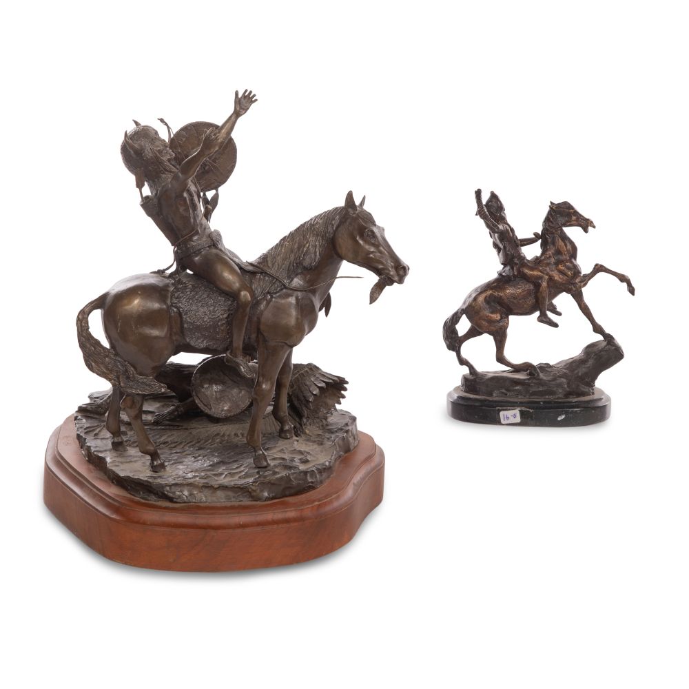 (2) total items including an undated, signed and titled on bottom front edge, mounted on a wood base; together with “Scalp”, a bronze sculpture on marble base after Frederic Remington