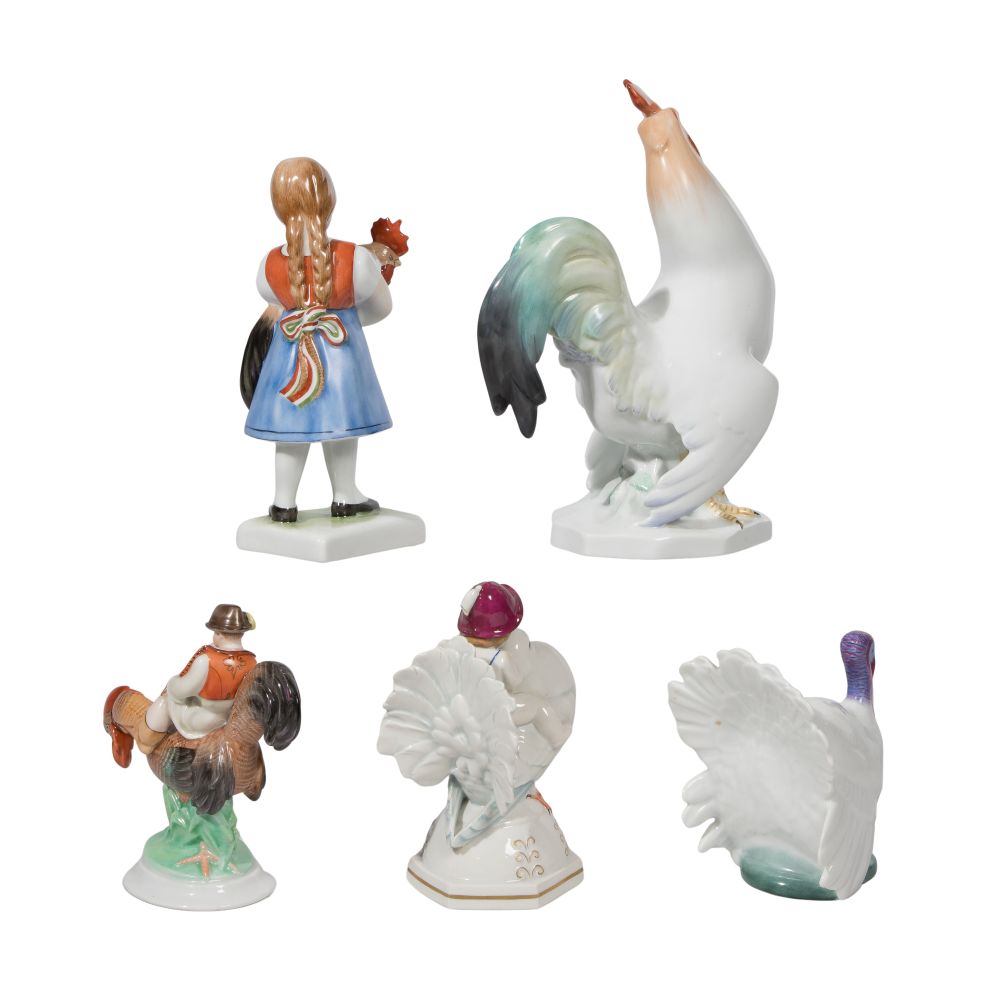 (5) items including a #5014 rooster, a turkey, a #5568-0-001C girl holding a rooster, a #5458 boy riding a rooster and a baby riding a pigeon, all marked underside