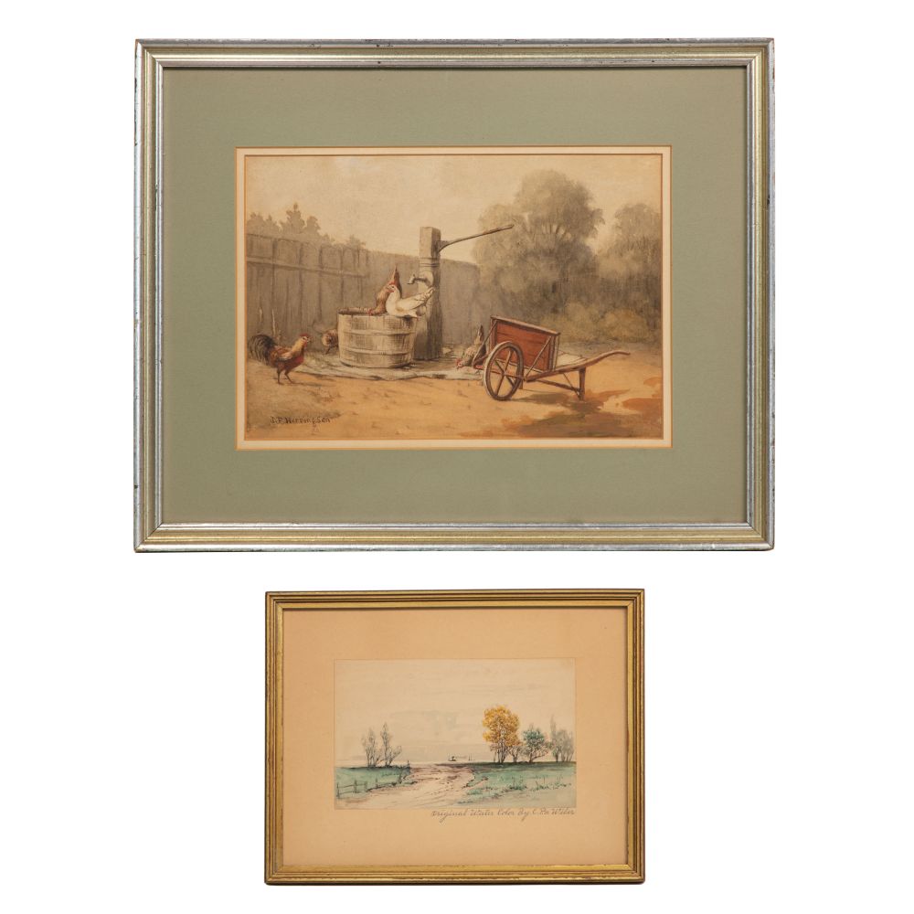 (2) total items including an undated, signed “J. F. Herring Sen” depicting a barnyard scene having chickens matted behind glass in a wood frame; together with an undated Carl Phillip Weber (American, 1850-1921) watercolor, depicting a landscape and distant watercraft, laid down on backing having pencil inscription “Original Watercolor by C. P. H. Weber”, behind glass in a wood frame having a newsprint clipping verso giving attribution