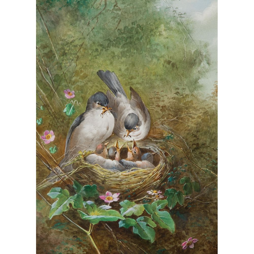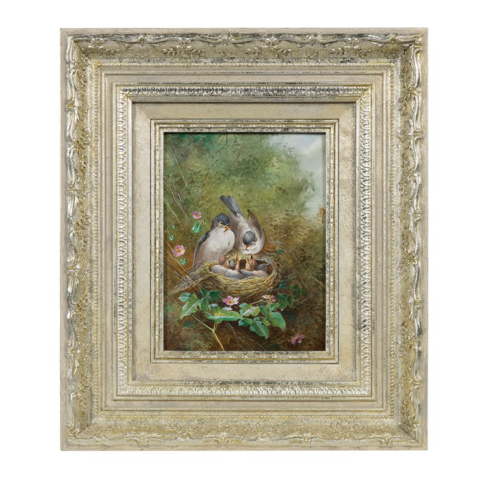 Undated, unsigned, having artist business card stapled to frame, depicting nesting chickadees, in a gold-tone gesso on carved wood frame