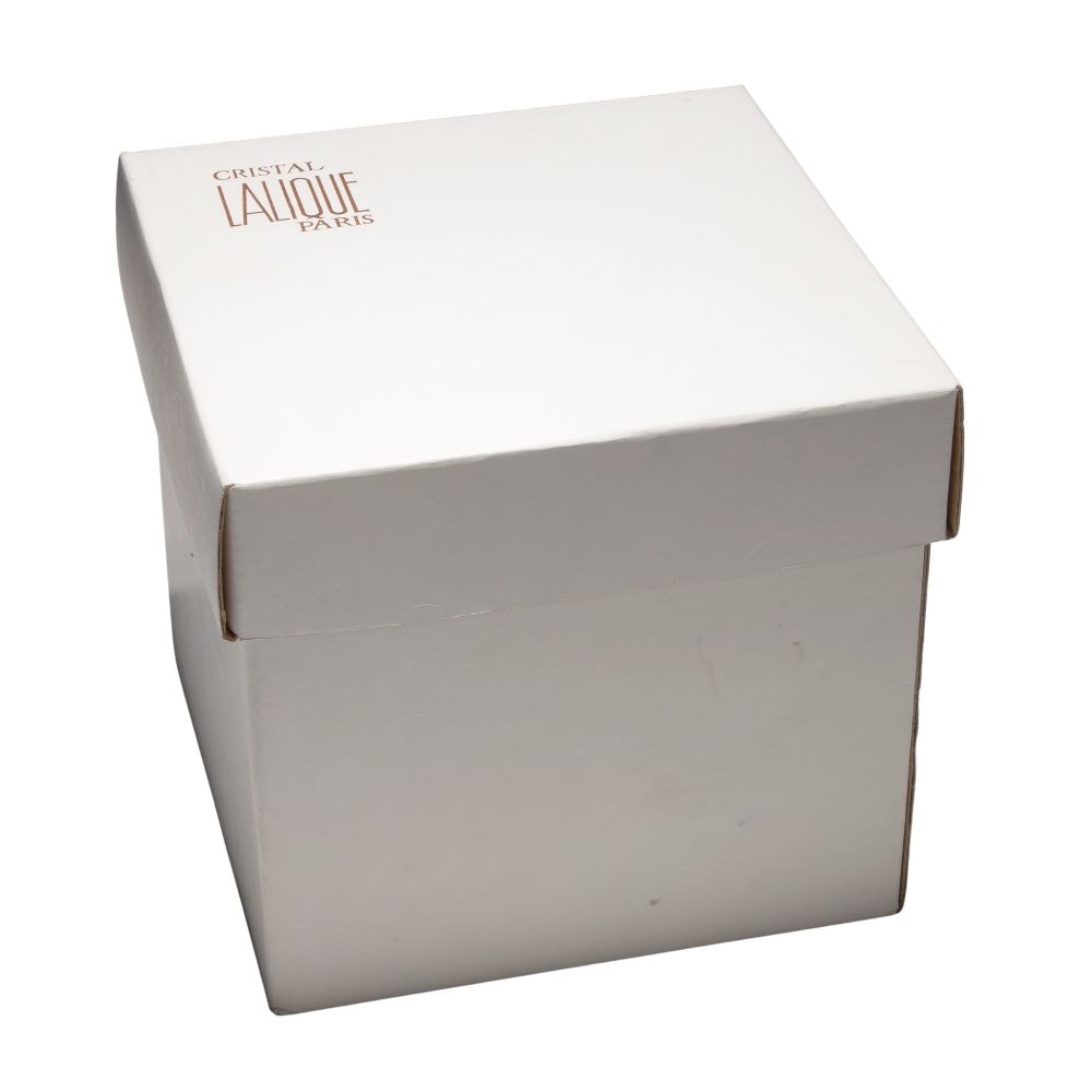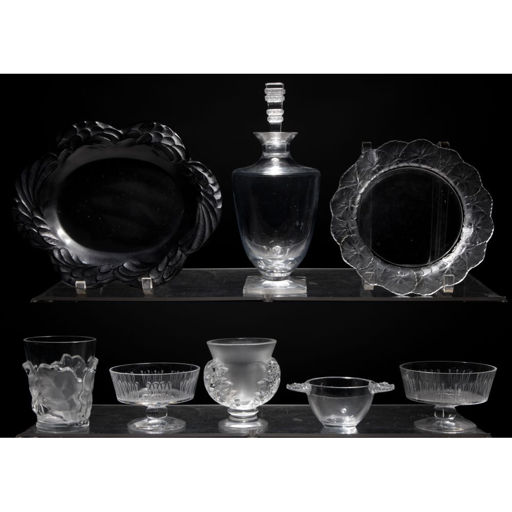 (8) items including an Argos decanter and stopper, a Laure Noir tray, a Chene tumbler, a Saint-Cloud vase, an Honfleur plate, an Honfleur two-handled bowl, (2) Isabelle footed bowls, all having engraved marks, with a Lalique box