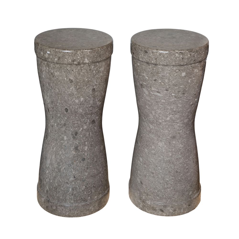 A pair of gray brecciated marble cylindrical pedestals having slight waists and raised bands at tops and feet