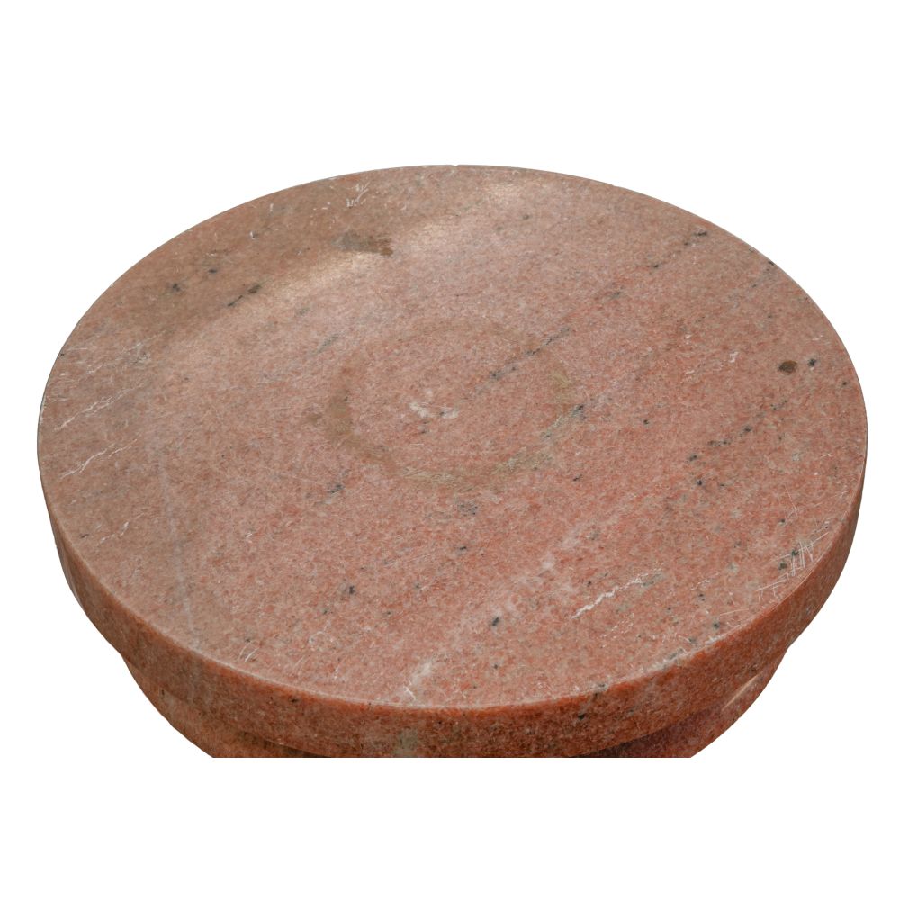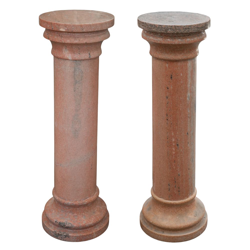 A pair, columnar shaped speckled pink marble, round tops and bases, one having a darker mottled top