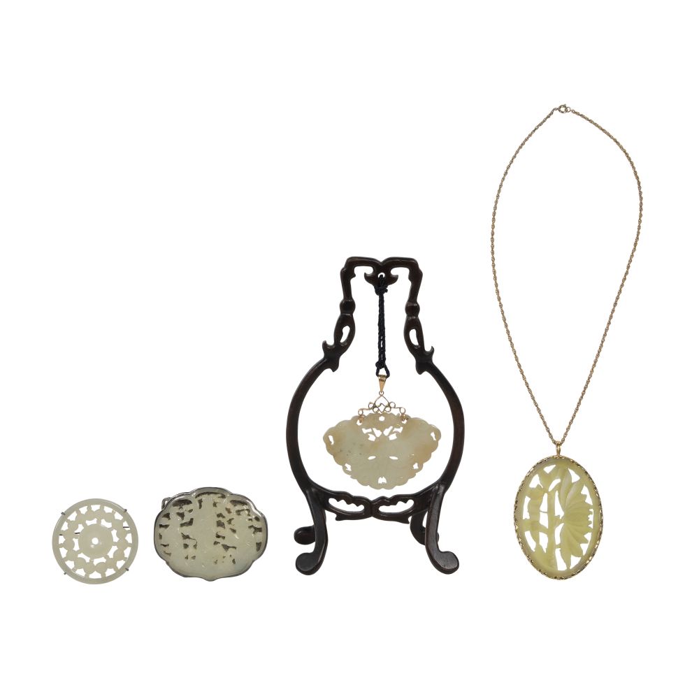 (5) total items including a belt buckle having a backing (marked “sterling”), a brooch, (2) pendants having gold plated mounts (one having a chain, the other on cord), all having pierced and carved jade; together with a wood stand for suspending a pendant