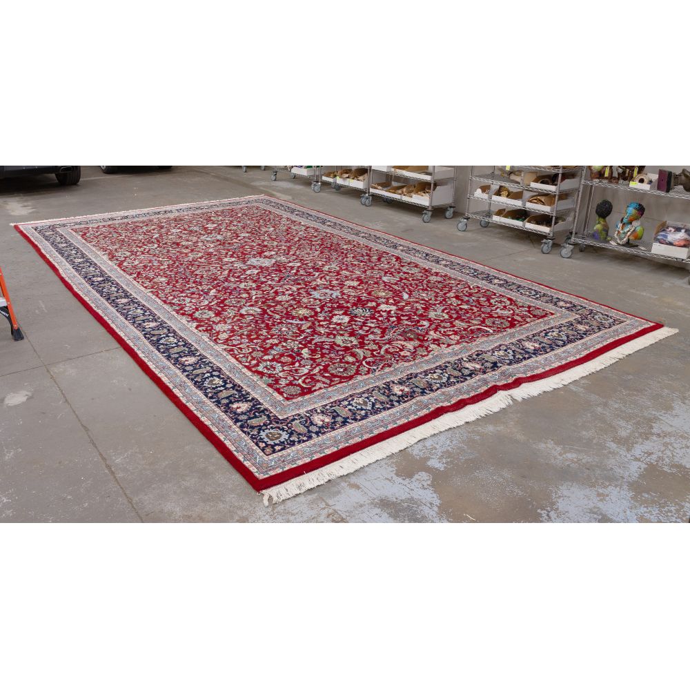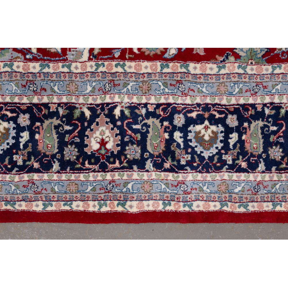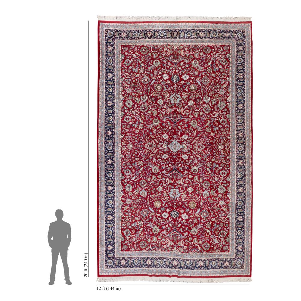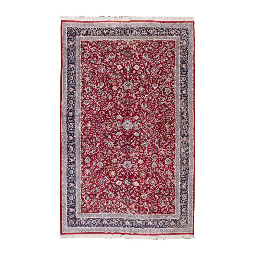 Palatial size in the Isfahan style, having an abstract floral and geometric motif in hues of green, blue, tan and mauve on a red field, original tag