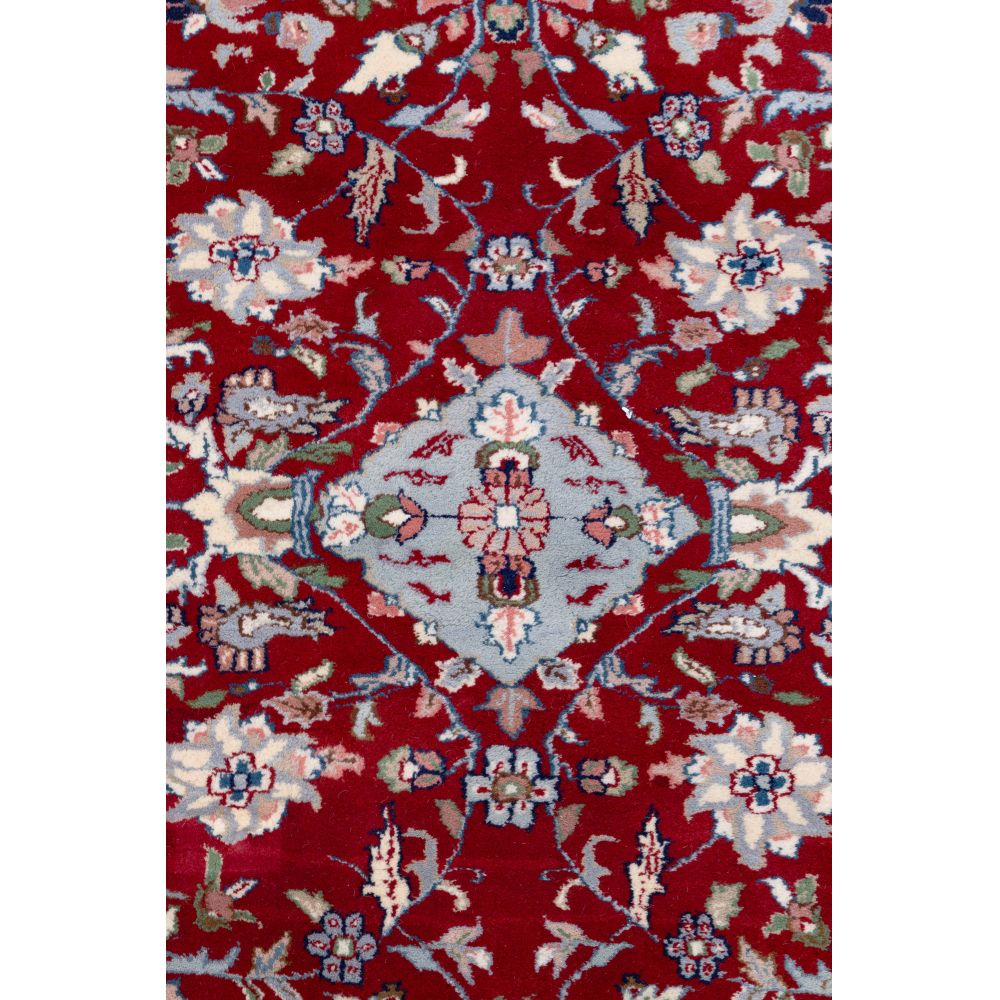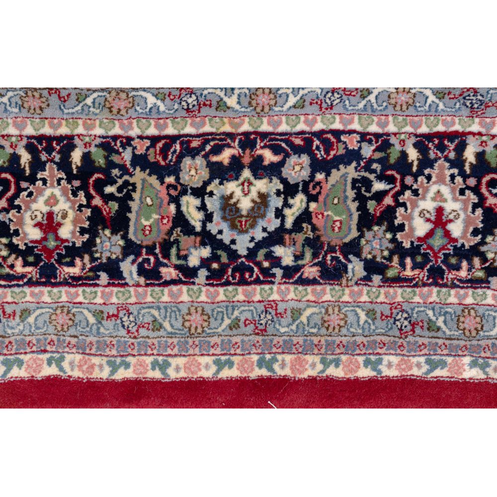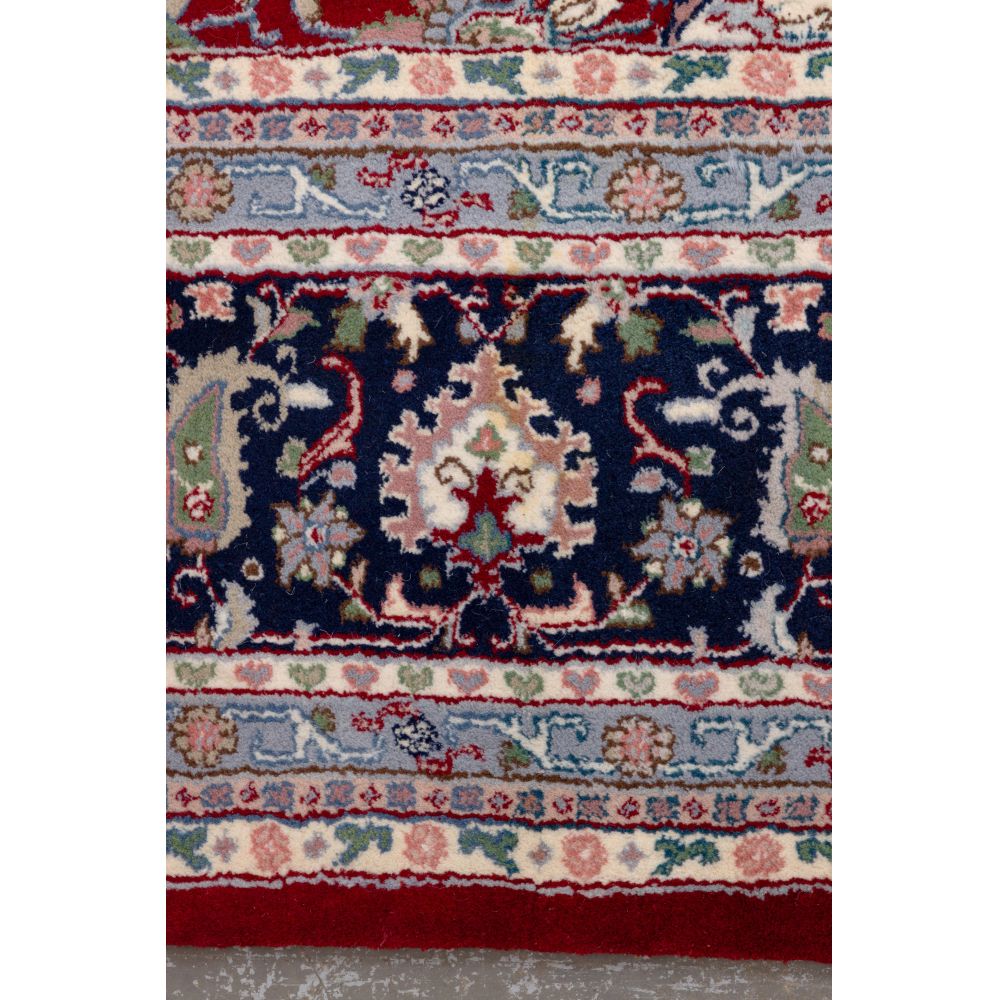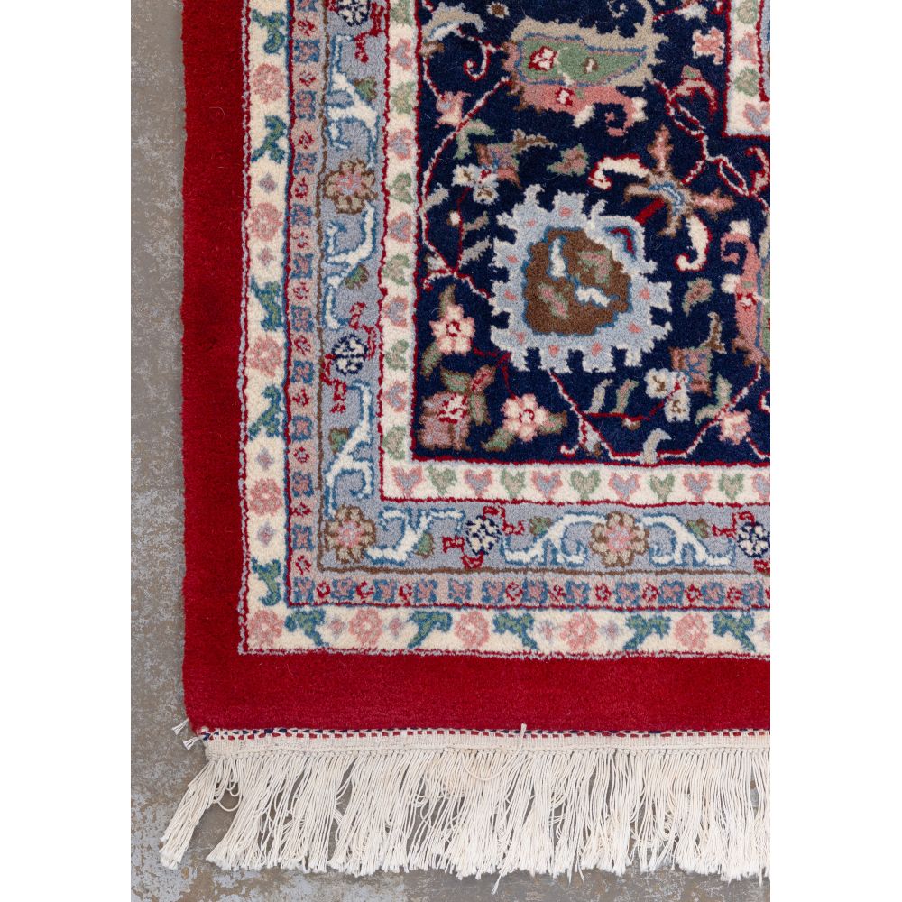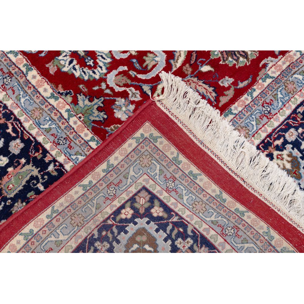 Palatial size in the Isfahan style, having an abstract floral and geometric motif in hues of green, blue, tan and mauve on a red field, original tag