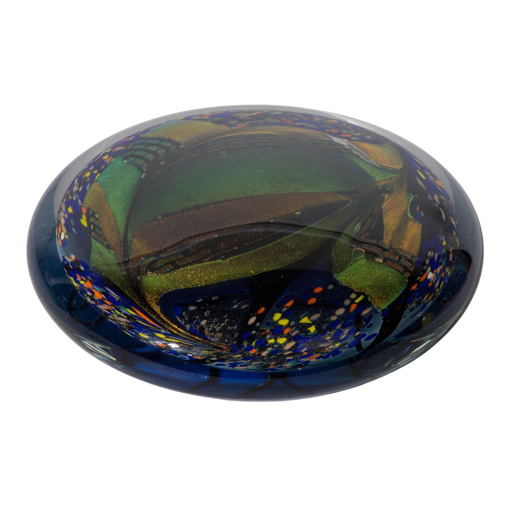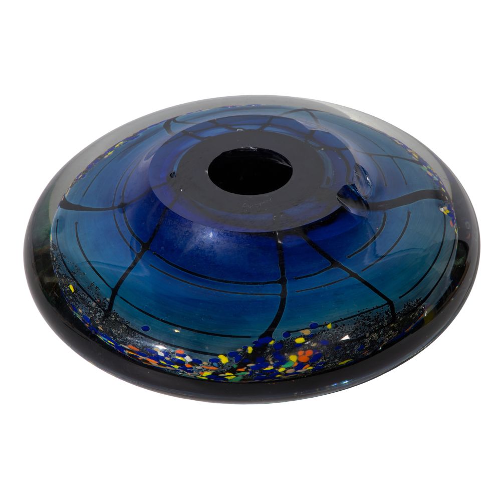 Undated, engraved signature underside, blown glass having multi-color dichroic and cane elements cased in clear, ground and polished underside having opening at center