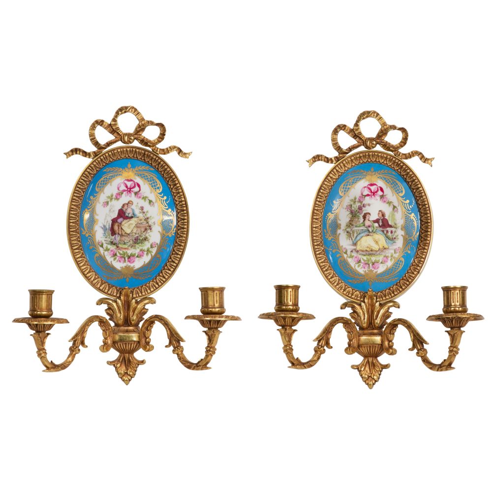 LOT #402 - Sevres Style Porcelain and Ormolu Wall Sconces