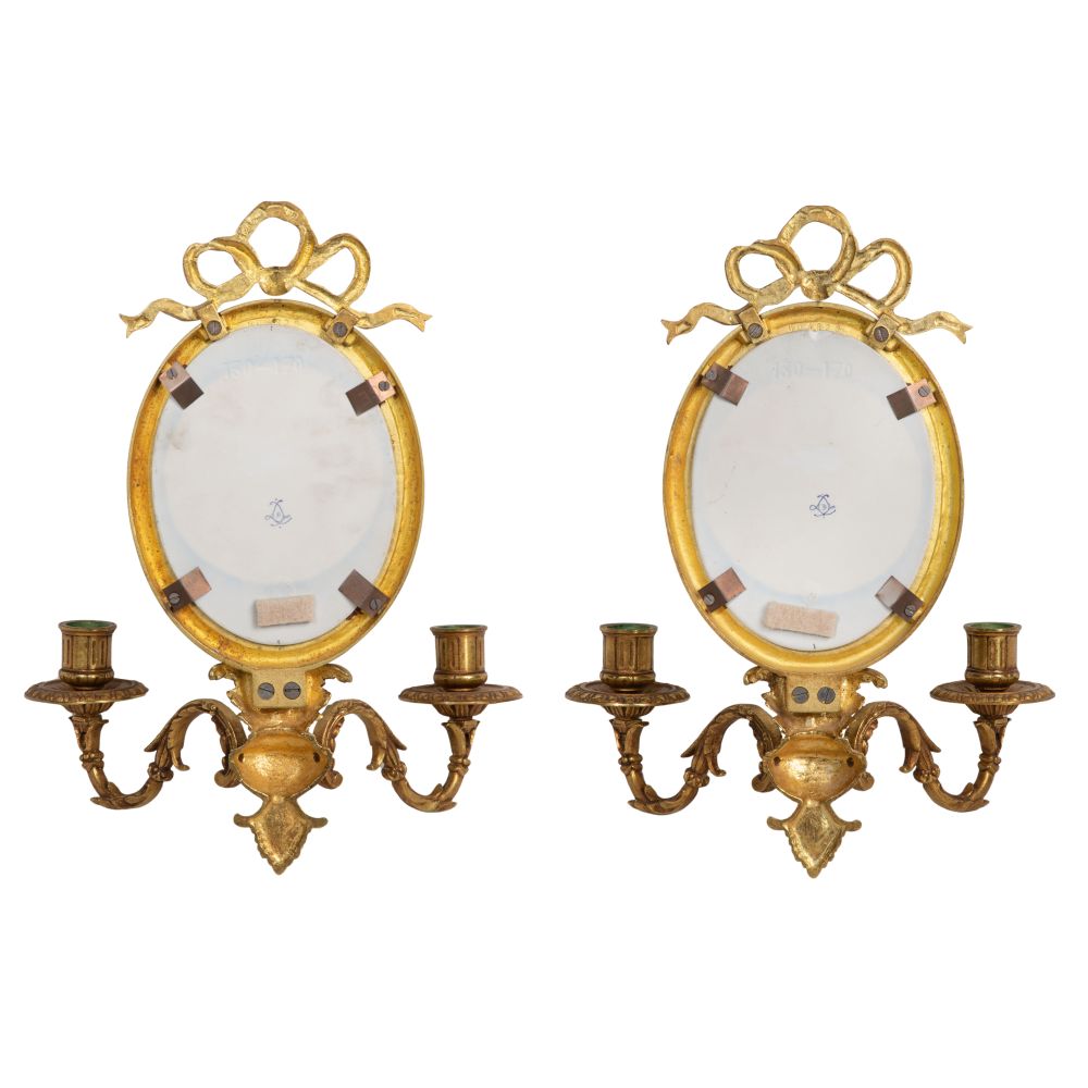 A matched pair, each having an oval pictorial porcelain plaque, both having stamped interlaced and impressed “130-170” marks verso, mounted in Baroque style ormolu frames having two candelabra arms, cast #4626-5 on backs of ribbon finials, hanging hardware present and bagged