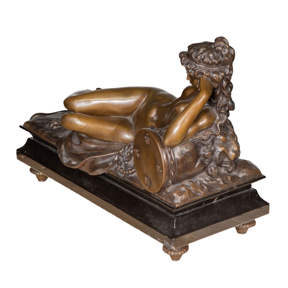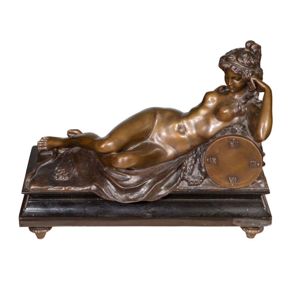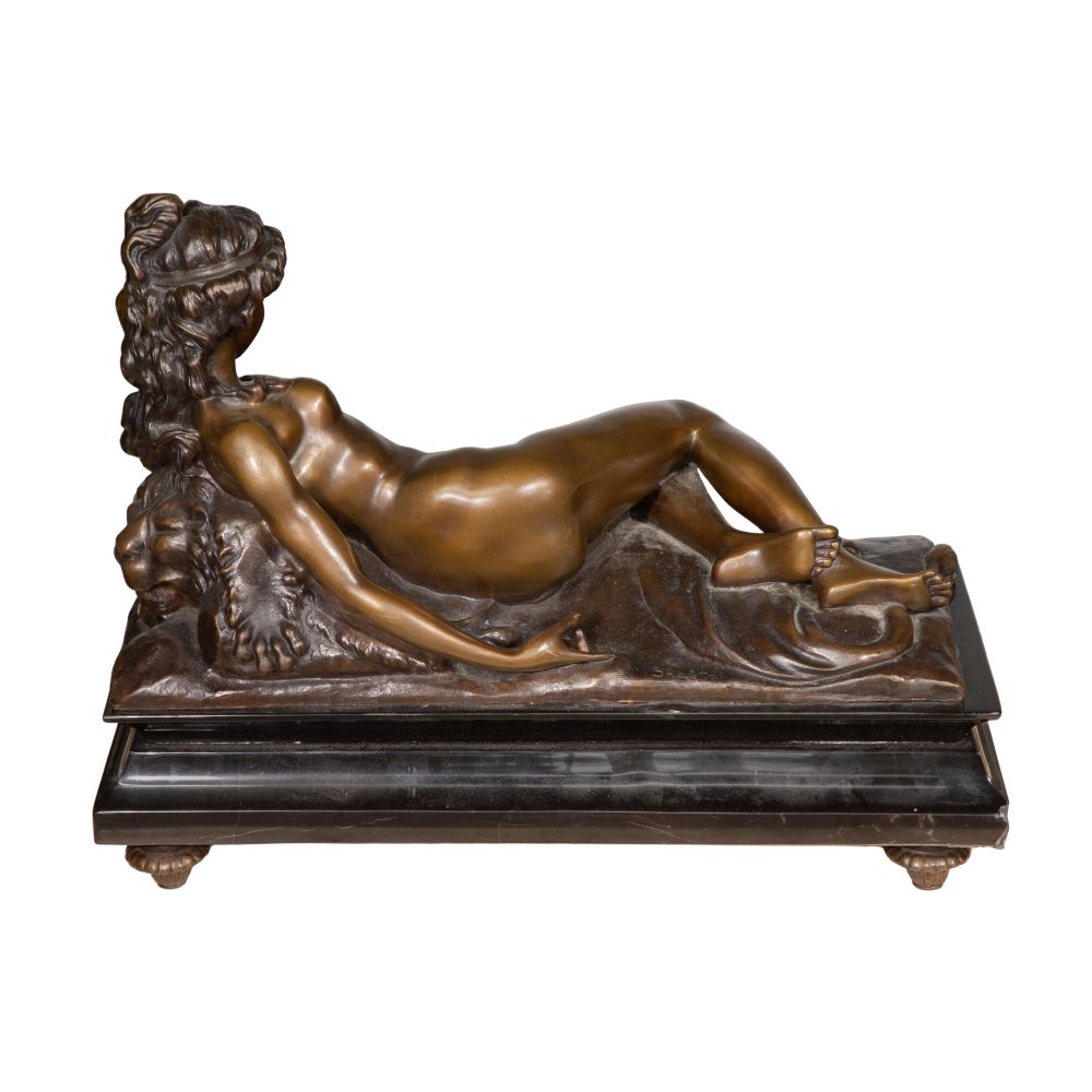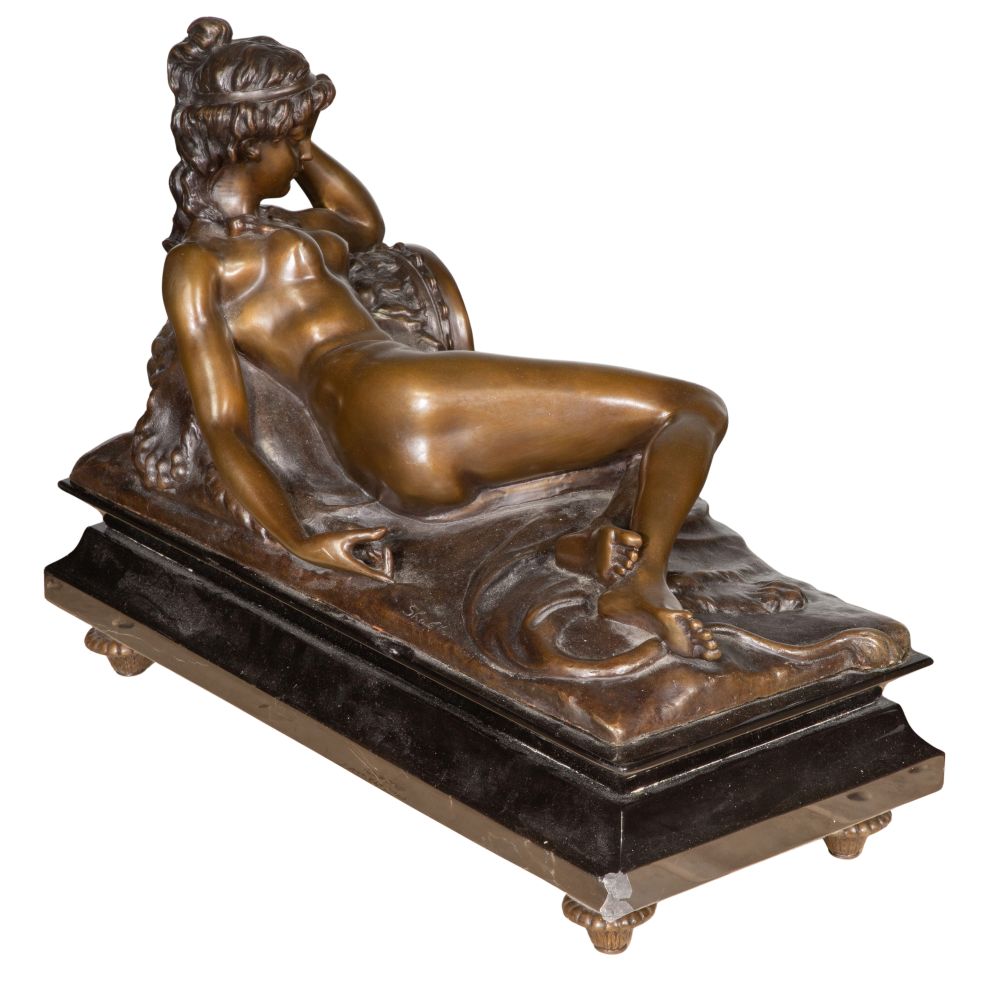 Undated, incised signature on back edge, depicting a recumbent female, mounted on a marble footed base