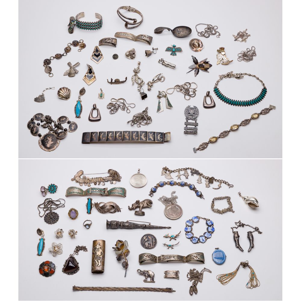 Including Native American and Asian style bracelets, earrings, pendants, necklaces and rings (most marked “sterling” / “925”)