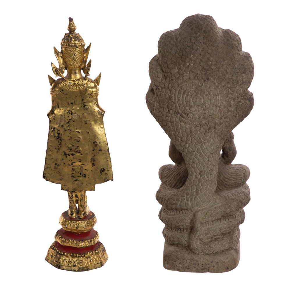 (2) total items including a stone figure of the Buddha Muchalinda, depicting the Buddha seated in meditation on the coiled body of a seven-headed serpent king, who forms a protective canopy overhead; together with a gilded standing Buddha