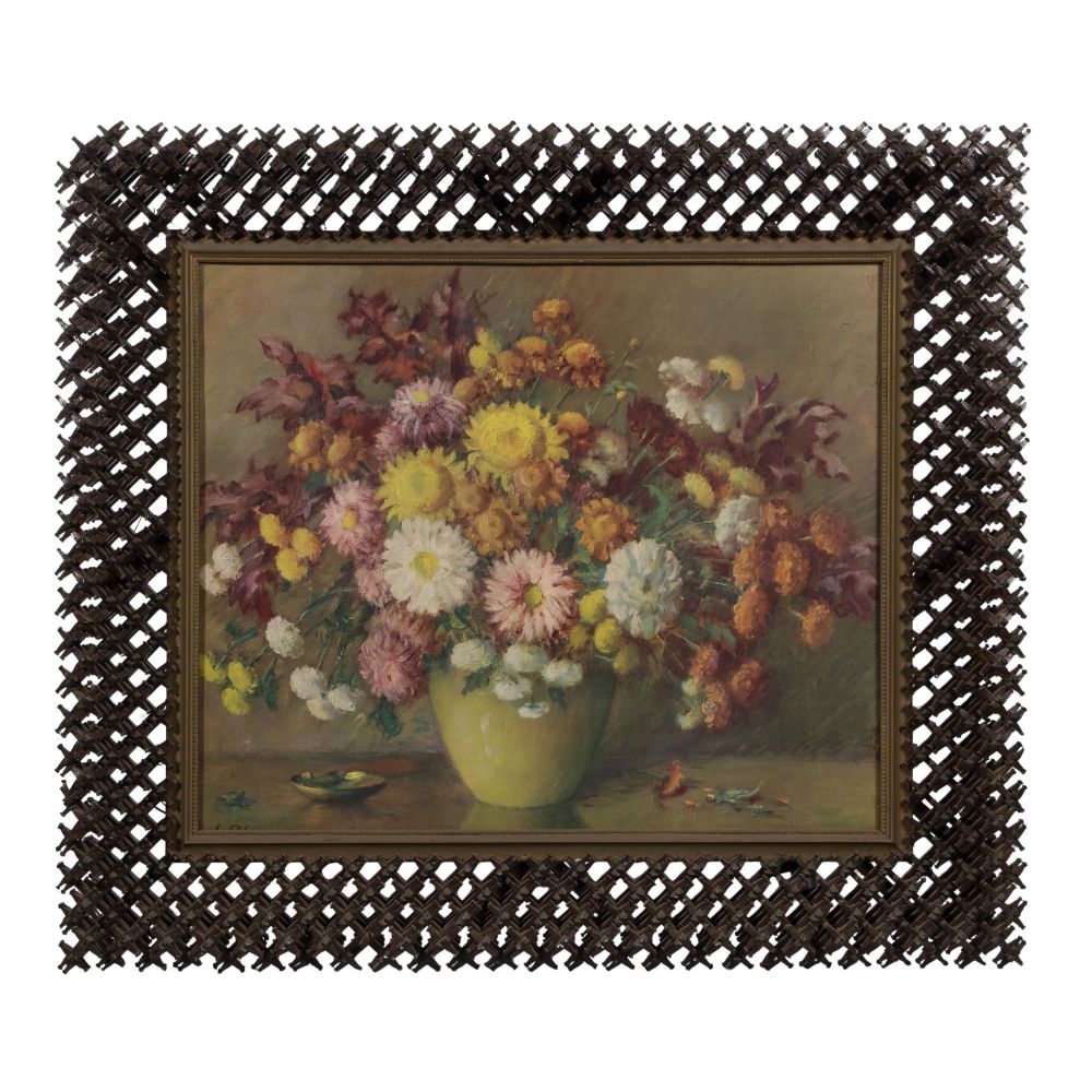 20th century, assembled wood frame, having a floral reproduction print illegibly signed under glass