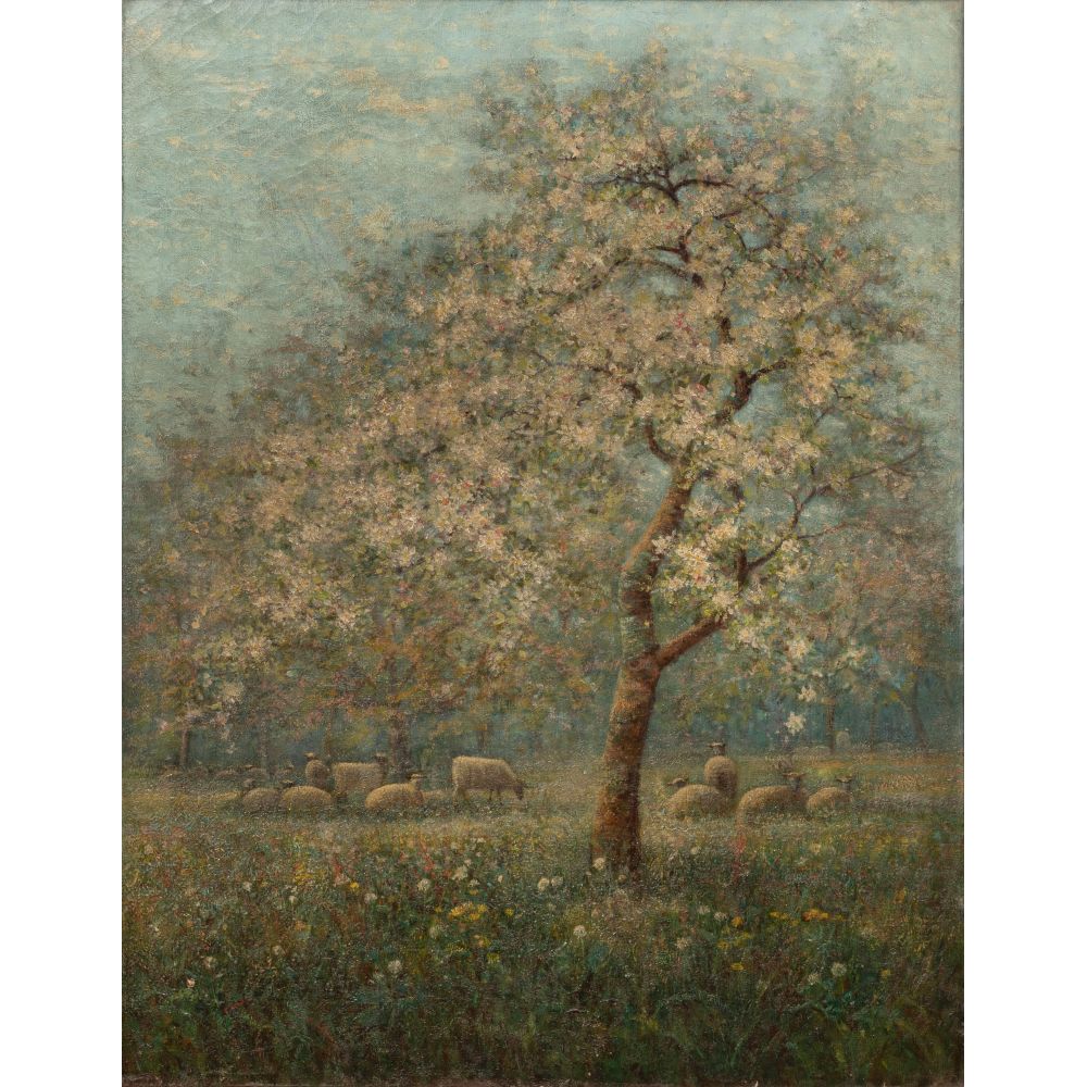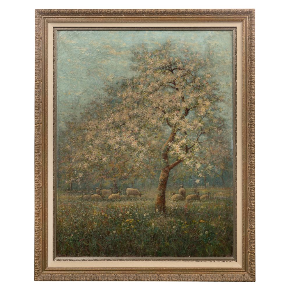 Undated, unsigned, depicting a flock of sheep grazing beneath a flowering tree, linen lined gold-tone wood frame