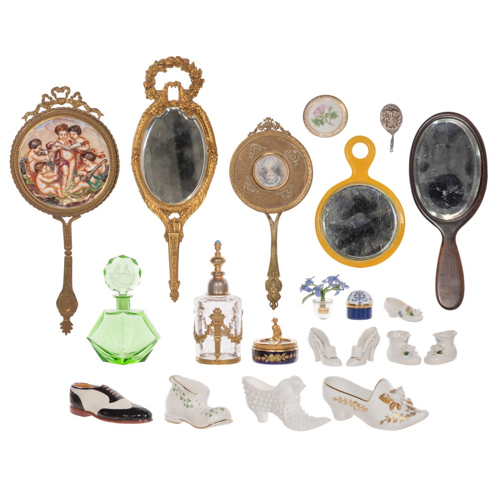 (19) items including (7) hand mirrors of various sizes and styles, (2) perfumes including a brass mounted engraved and a green glass, (4) single porcelain shoe form vases (one Royal Tara, another Limoges), a similar of milk glass, (2) pairs of porcelain shoes, a Limoges ashtray marked “Dior” having a cherub on rim, a Halcyon Days for Neiman Marcus enamel trinket box and a glass pot of porcelain flowers labeled “Made in Portugal”